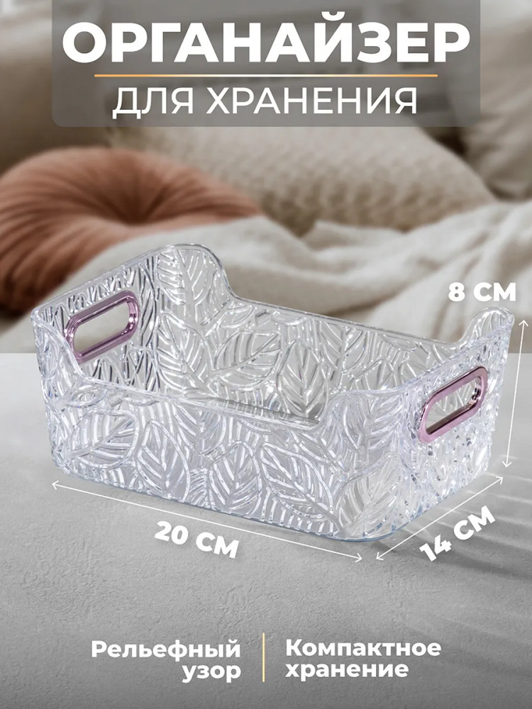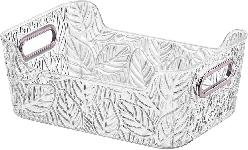 Органайзер для хранения от El Casa поможет вам эстетично и эффектно поддерживать в доме порядок! Размер изделия — 20×14×8 см, размер дна — 17×11,5 см. Изготовлен из пластика. Прозрачная ёмкость украшена рельефным лиственным узором и оснащена металлическими ручками лилового цвета. Благодаря лаконичному дизайну она гармонично дополнит интерьер любой комнаты и найдёт место в разных частях вашего дома. В спальне заполните изделие ватными дисками, ушными палочками или другими средствами уходовой косметики. В прихожей используйте её для ключей, носовых платков или перчаток.