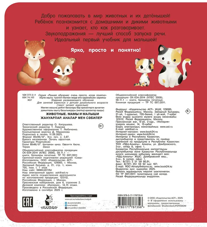 Серия: Раннее обучение: очень просто, когда понятно «Животные. Мамы и малыши» — это первая книжка в картинках для самых маленьких. На страницах книги дети познакомятся с кошкой и котёнком, собакой и щенком, коровой и телёнком и другими животными. Каждая картинка сопровождается крупной подписью и звукоподражанием — способствуют запуску речи. А качественная мелованная бумага и закруглённые углы страниц делают книгу прочной и безопасной — она не порвётся и не помнётся, а ребёнок не порежется! |