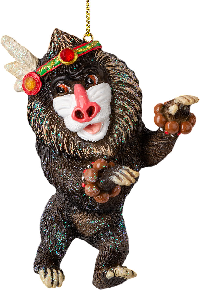Серия: Венецианский Карнавал Орангутан удивляет необычным костюмом индейца. На лапах красуются крупные браслеты, повязка на голове декорирована рубиновым камнем. Детали тщательно прорисованы, тело покрыто мелкими, едва заметными блестками. Оригинальное украшение будет ярко смотреться на елке, добавляя дух праздника в новогодний декор. Изделие является относительно тяжелым, предпочтительно использование на искусственной елке. |