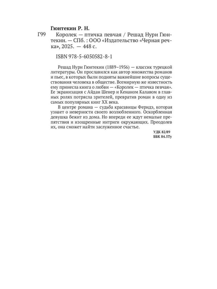 Решад Нури Гюнтекин (1889-1956) — классик турецкой литературы. Он прославился как автор множества романов и пьес, в которых были подняты важнейшие вопросы существования человека в обществе. Всемирную же известность ему принесла книга о любви — «Королек — птичка певчая». Ее экранизация с Айдан Шенер и Кенаном Калавом в главных ролях потрясла зрителей, превратив роман в одну из самых популярных книг XX века. В центре романа — судьба красавицы Феридэ, которая узнает о неверности своего возлюбленного. Оскорбленная девушка бежит из дома. Но впереди ее ждут немалые препятствия и изощренные интриги окружающих. Преодолев их, она сможет найти заслуженное счастье. |