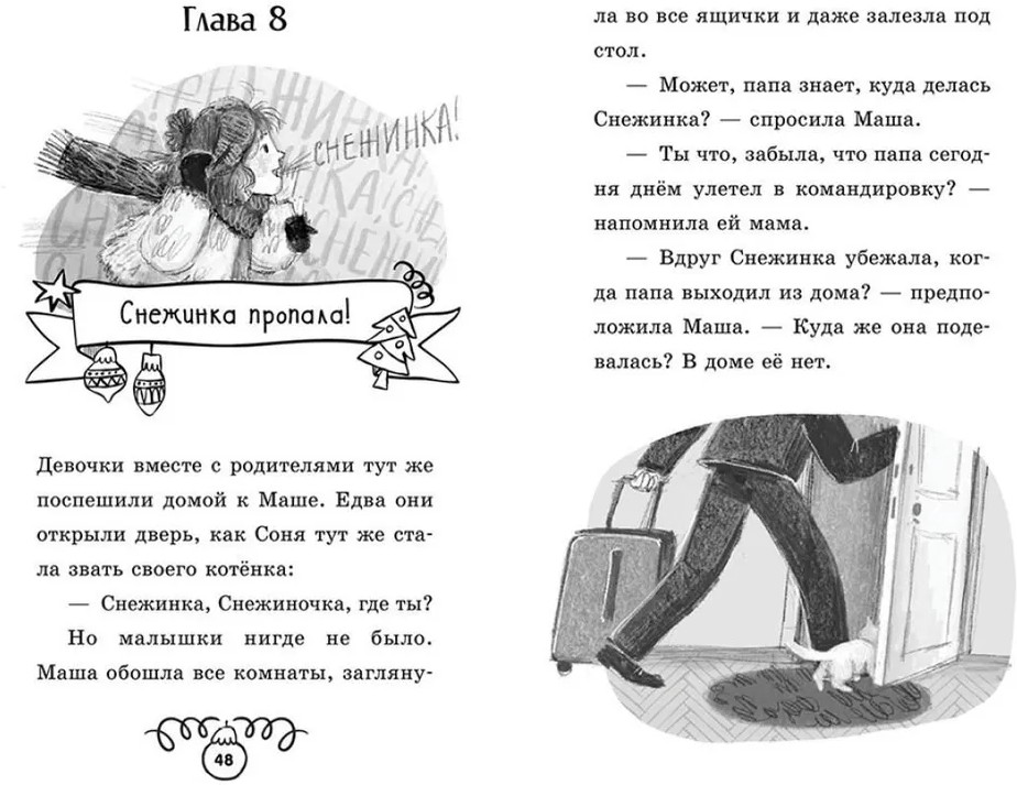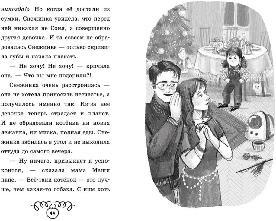 Серия: Пушистые истории Трогательная история о том, как девочка Соня и котенок Снежинка подружились. Книга Елены Ульевой о дружбе, заботе и вере в настоящее чудо! Школьница Соня мечтала о котенке. Однажды зимой случилось чудо. На ферме тети Розы черная кошка Мими родила белоснежного котенка — Снежинку. С первого взгляда Соня поняла: это судьба! С тех пор они стали неразлучны. Каждый день Соня училась ухаживать за малышкой и все настойчивее уговаривала родителей. В день, когда Соне разрешили забрать белое пушистое чудо, случилось немыслимое... Котенка по ошибке отдали другой девочке! Что теперь ждет Снежинку? Удастся ли Соне найти ее? |