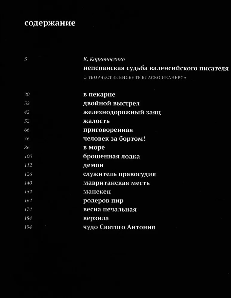 В сборник малой прозы испанского писателя Висенте Бласко Ибаньеса (1867–1928) вошли 16 рассказов: «В пекарне», «Двойной выстрел», «Железнодорожный заяц», «Жалость», «Приговоренная», «Человек за бортом!», «В море», «Брошенная лодка», «Демон», «Служитель правосудия», «Мавританская месть», «Манекен», «Родеров пир», «Весна печальная», «Верзила», «Чудо Святого Антония». Герои Бласко Ибаньеса — моряки и аристократы, юноши и умудренные опытом старцы, которые вступают в борьбу с жизненными обстоятельствами, стремясь обрести свое место в мире и справиться с разнообразными невзгодами на суше, на море и даже в лабиринтах собственной души. В предисловии внимание фокусируется на особенностях писательской манеры Бласко Ибаньеса и истории восприятия его рассказов в Европе и России. Издание адресовано ценителям испанской прозы XIX–XX вв. |