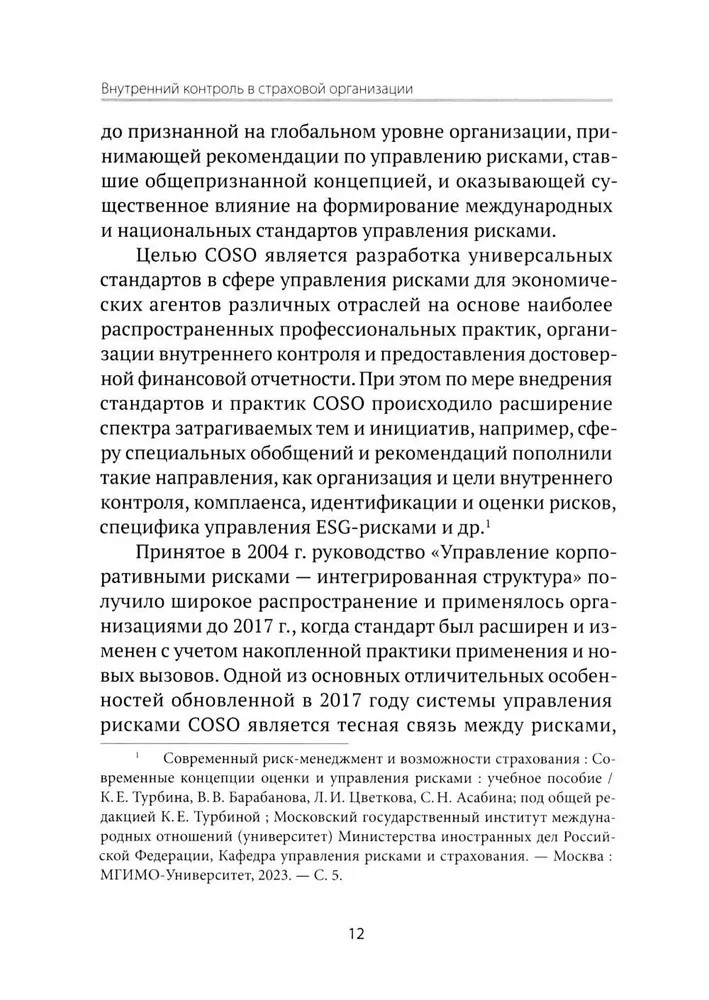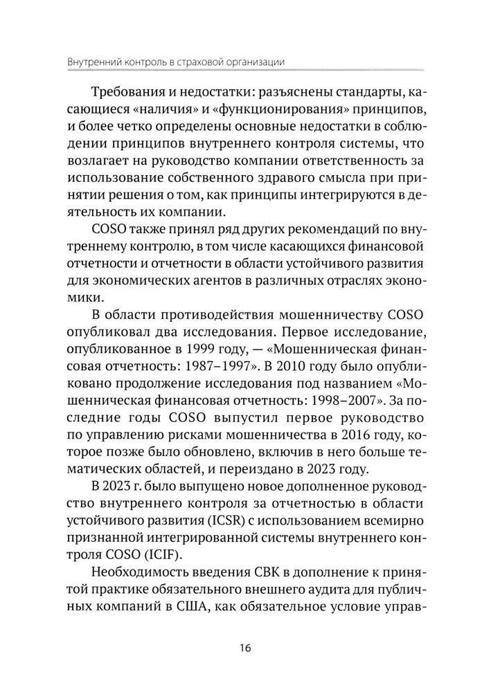 Серия: Современный риск-менеджмент и возможности страхования Учебное пособие знакомит с основными принципами внутреннего контроля как неотъемлемой компоненты современной системы управления рисками в соответствии с международными рекомендациями и стандартами, и российскими нормативными актами. Пособие содержит методические основы и практические решения для конфигурации трех линий защиты в страховой организации, дизайна контрольных процедур, формирования системы внутреннего контроля и методов оценки ее эффективности в соответствии с рекомендациями Комитета организаций — спонсоров Комиссии Тредвея (COSO), ФНС и Банка России. Для студентов, изучающих дисциплины, связанные с риск-менеджментом, и для всех заинтересованных специалистов в области исследования. |