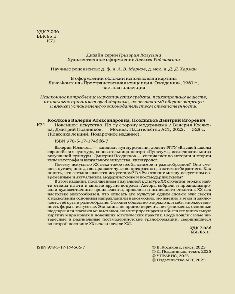 Серия: Классика лекций. Подарочное издание Валерия Косякова — кандидат культурологии, доцент РГГУ «Высшей школы европейских культур», основательница центра «Пунктум», исследовательница визуальной культуры. Дмитрий Поздняков — специалист по истории и теории кинематографа и визуального искусства, культуролог. Почему искусство XX века такое необъяснимое и разнообразное? Оно смешит, пугает, иногда возвращает чувство прекрасного, а затем отбирает его. Как понять, что сегодня является искусством? В чём отличие между искусством современным и актуальным, модернистским и постмодернистским?