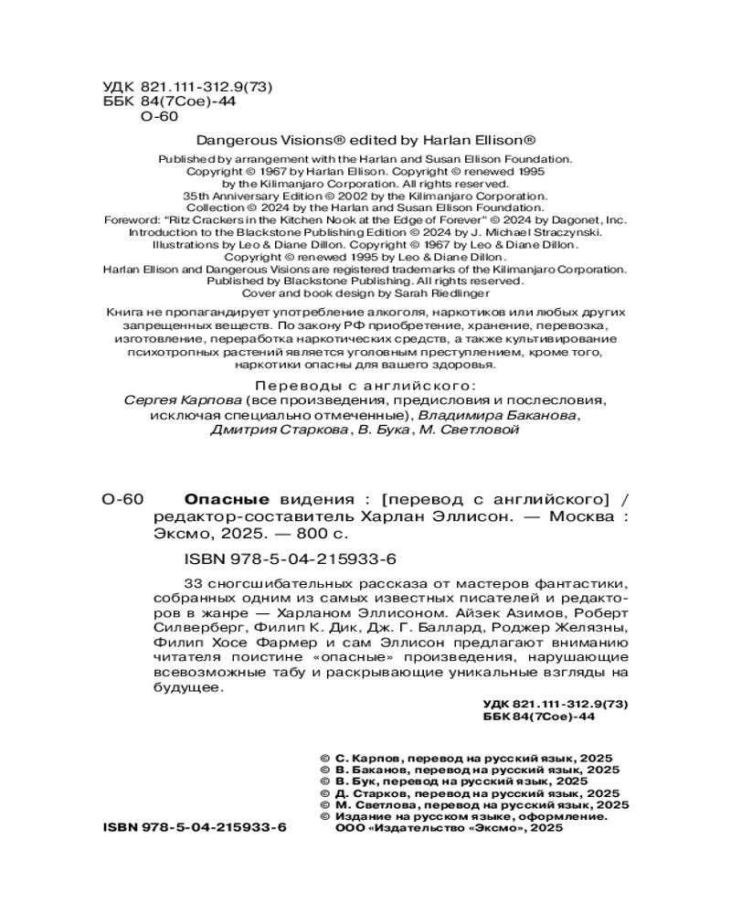 Серия: Fanzon. Опасные видения. Главные антиутопии Антологии редко творят историю, но «Опасные видения» — великое и удивительное исключение. В далеком 1967 году, во время студенческих волнений, бесславной войны во Вьетнаме и психоделической революции, писатель и редактор Харлан Эллисон совершил настоящую культурологическую провокацию. Он попросил ведущих фантастов своего времени написать для составляемого им сборника по рассказу, который бы выражал истинное, «опасное» видение будущего и поэтому принципиально не мог быть опубликован в то время. А перечень авторов действительно впечатлял: Айзек Азимов, Филип К. Дик, Роджер Желязны, Пол Андерсон, Роберт Силверберг, Филип Хосе Фармер и другие. Неудивительно, что прекрасные, уникальные, шокирующие и меняющие восприятие произведения, впервые опубликованные под этой обложкой, в дальнейшем частенько становились номинантами и лауреатами главных жанровых премий «Хьюго» и «Небьюла». |