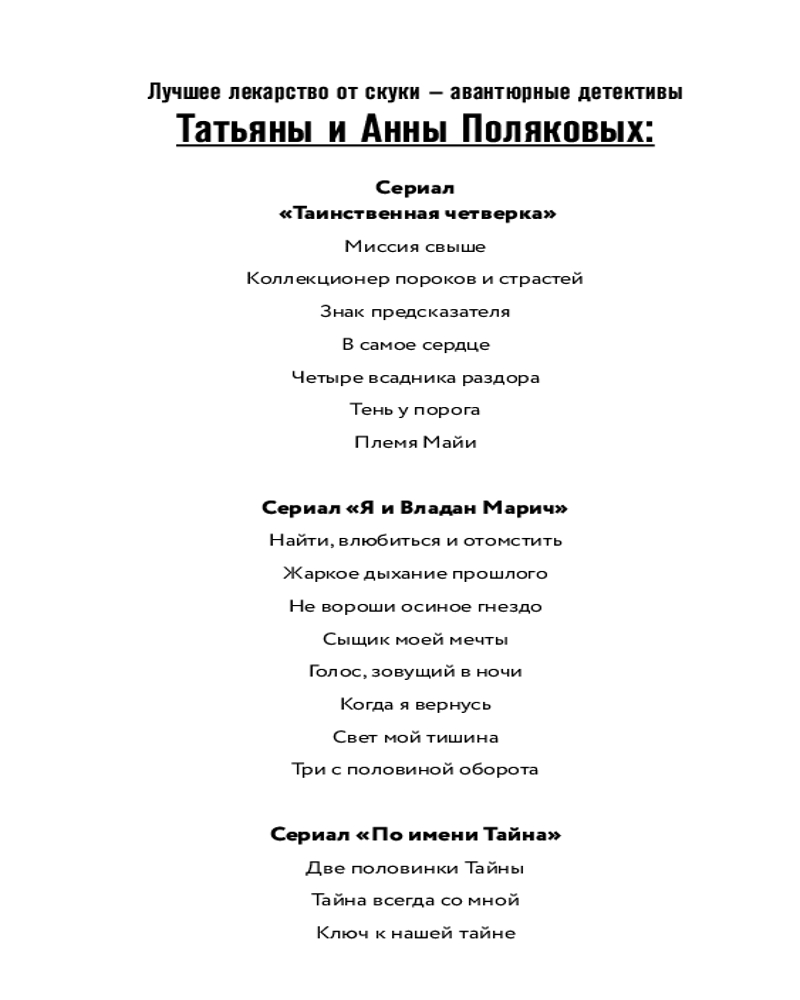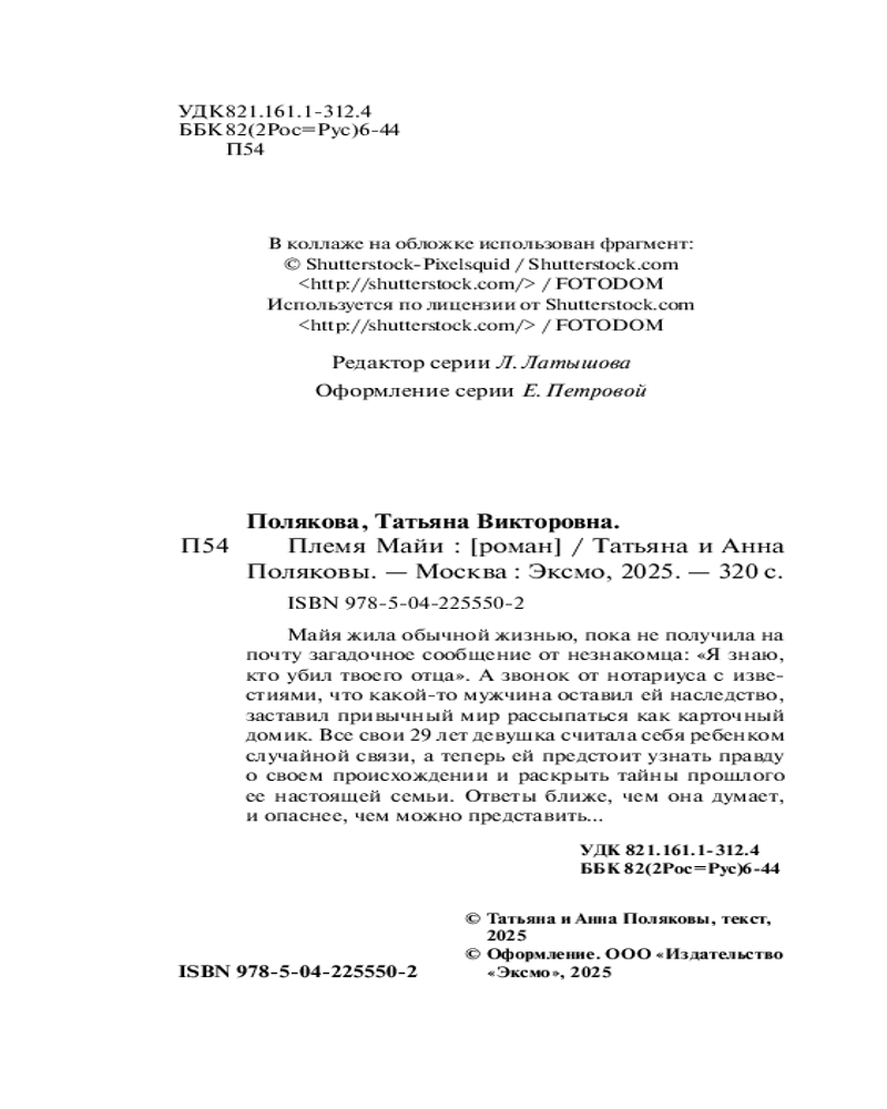 Серия: Детективы с авантюрой Татьяны и Анны Поляковых Майя жила обычной жизнью, пока не получила на почту загадочное сообщение от незнакомца: «Я знаю, кто убил твоего отца». А звонок от нотариуса с известиями, что какой-то мужчина оставил ей наследство, заставил привычный мир рассыпаться, как карточный домик. Все свои 29 лет девушка считала себя ребенком случайной связи, а теперь ей предстоит узнать правду о своем происхождении и раскрыть тайны прошлого ее настоящей семьи. Ответы ближе, чем она думает, и опаснее, чем можно представить... |