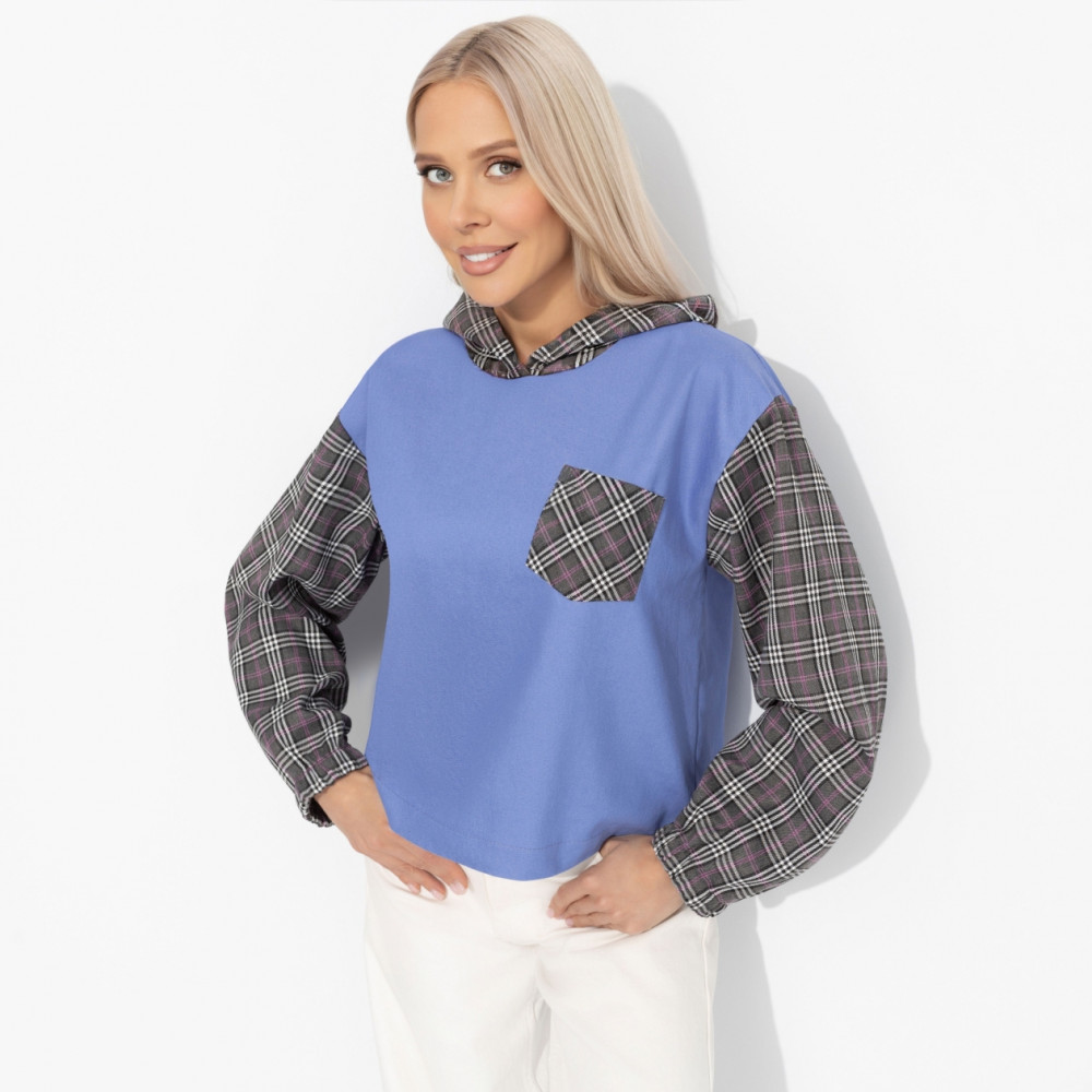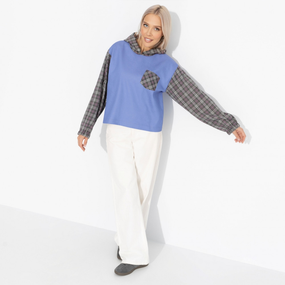 Она оделась в уютную клетку, как героиня её любимых ромкомов, где каждый квадратик свитшота — это кадр из истории о простом счастье. Это не просто узор, а наследие кинолегенд, где школьные коридоры и осенние свидания пахли попкорном и свободой. Свитшот станет униформой для тех, кто верит в хэппи-энды. Свитшот укороченный с капюшоном. Комбинация двух типов ткани. Рукава оформлены скрытой резинкой. Есть карманы.