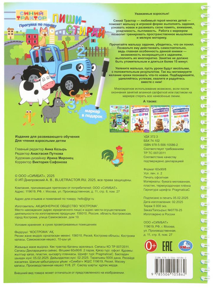 Серия: Синий трактор Брошюра на спирали с маркером «Синий Трактор. Прогулка по городу» из серии «Пиши-стирай» ТМ «УМка» включает в себя занимательные развивашки для малышей. Многоразовые брошюры серии «Пиши-стирай» с персонажами популярного детского мультсериала станут любимыми у вашего ребёнка. Весь познавательный материал представлен интересными игровыми заданиями, которые можно выполнять снова и снова. Для большего удобства в комплекте уже предусмотрен маркер, на колпачке которого находится специальная губка для стирания написанного. |