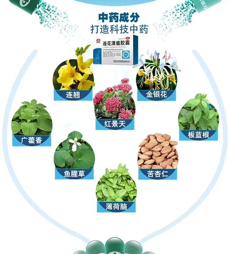 Жимолости японской цветок (Lonicerae flos), Форзиции плод (Forsythiae Fructus), Вайды корень (Isatidis Radix), Абрикоса семя горькое (Armeniacae semen amarum), Гипс отваренный (Gypsum fibrosum), Щитовника толстокорневищного корневище (Dryopteridis crassirhizomae rhizoma), Хауттуинии трава (Houttuyniae herba), Пачули трава (Pogostemonis Herba), Ревеня корневище и корень (Rhei Radix et Rhizoma), Родиолы розовой корень (Rhodiolae Radix), Ментол ( Mentholum), Солодки корень обработанный (Glycyrrhizae radix preparata).