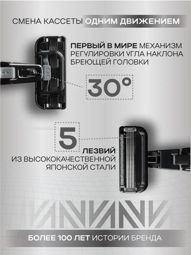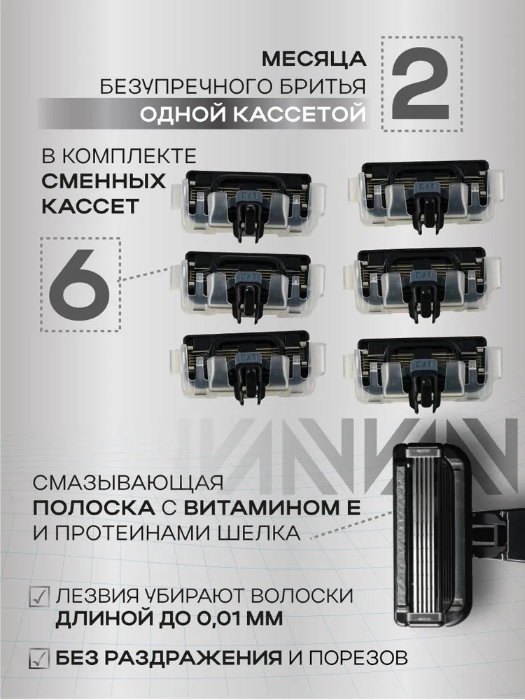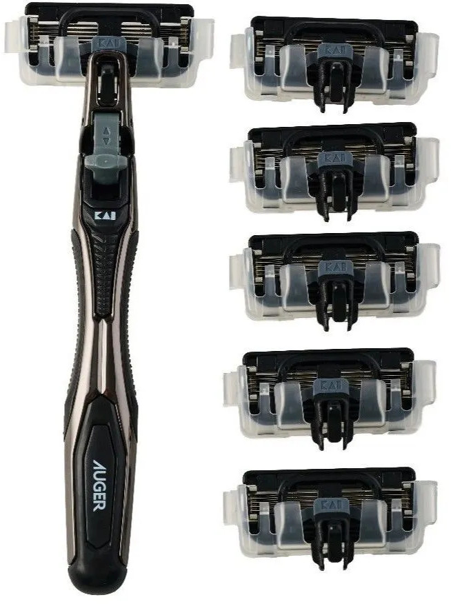 5 лезвий из высококачественной стали обеспечивают гладкое бритье, а смазывающая полоска с витамином Е и протеинами шелка сохраняет мягкий контакт с кожей. Одной сменной кассеты хватает до 2 месяцев бритья. В комплекте бритвенный станок и 6 сменных кассет. С AUGER вы экономите время, максимально упрощая процедуру бритья.