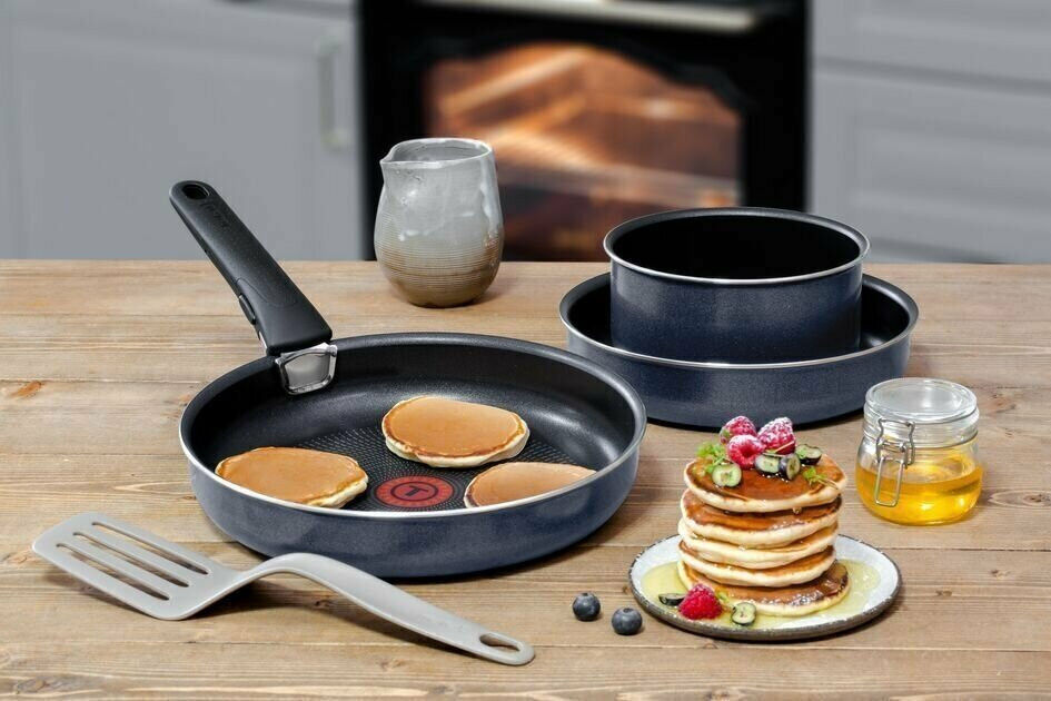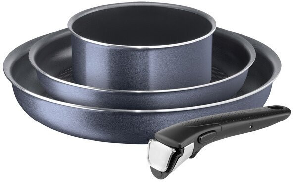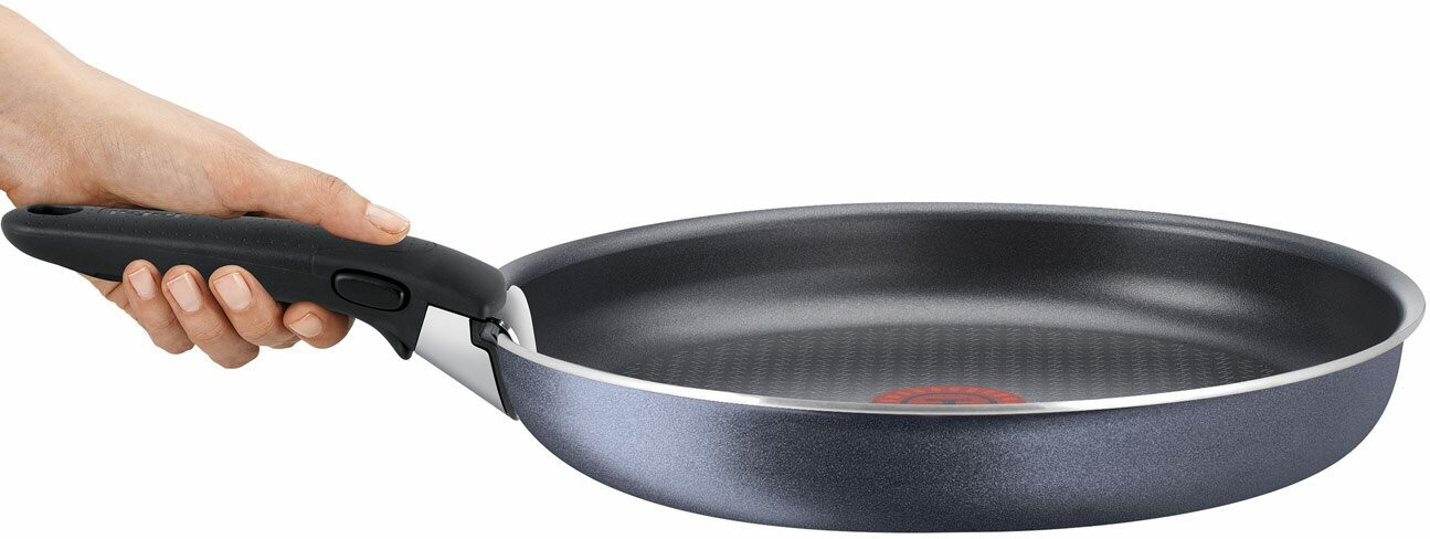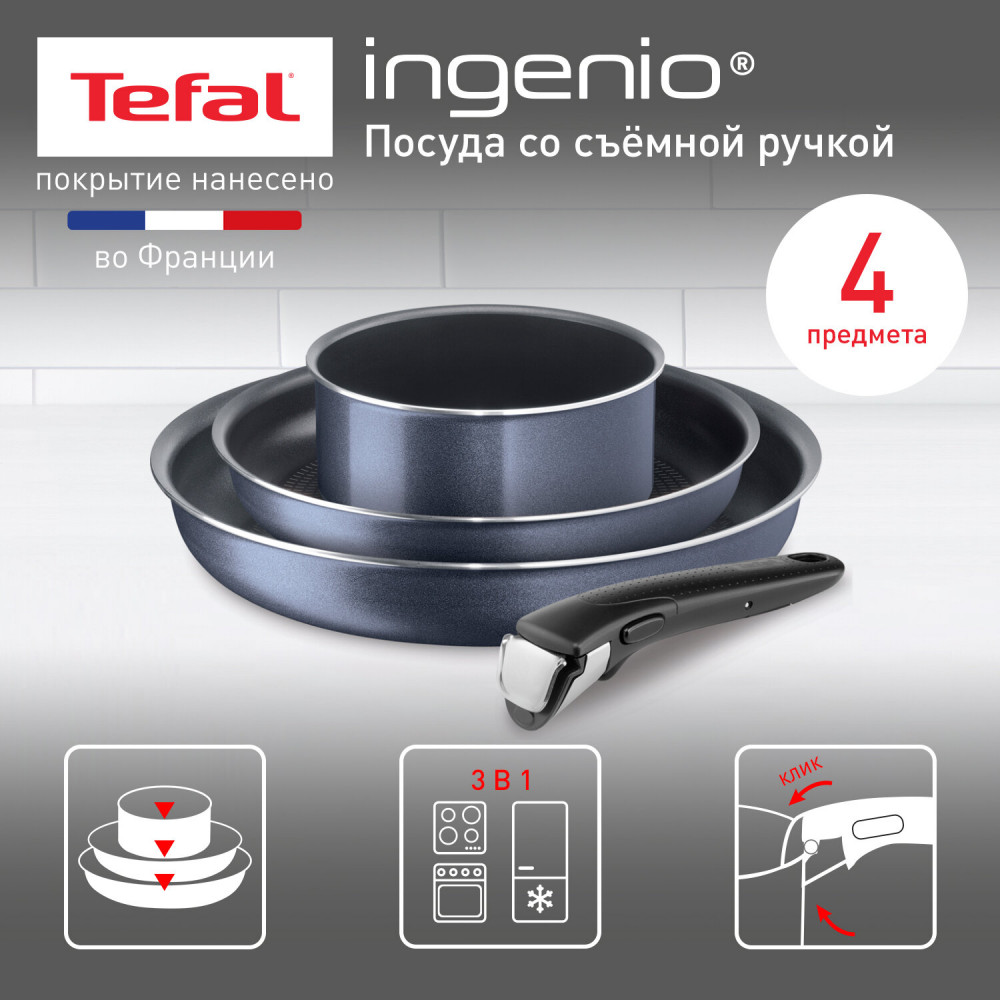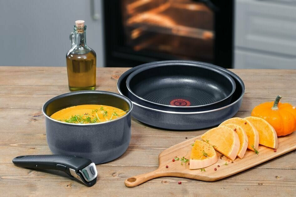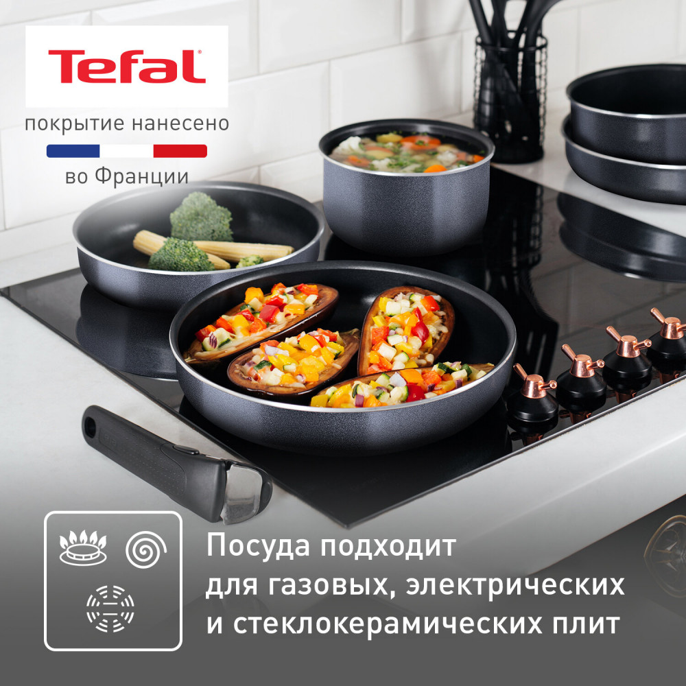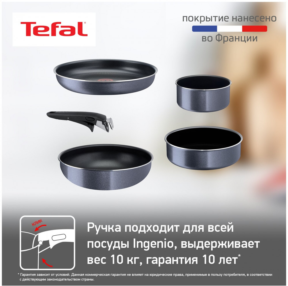 Tefal Ingenio Twinkle Grey: практичная посуда со съемной ручкой. Набор посуды Tefal Ingenio Twinkle Grey прекрасно подойдет для совершенствования вашего кулинарного мастерства. Благодаря прочному дну, изготовленному по технологии Durabase, посуда подойдет для всех типов плит, кроме индукции. Внешнее и внутреннее антипригарное покрытие PowerGlide обеспечивает отличные антипригарные свойства и повышенную износостойкость даже при длительном и ежедневном использовании благодаря усовершенствованному верхнему слою. Запатентованный индикатор температуры Thermo-Spot вовремя подскажет, когда посуда нагрелась до оптимальной температуры и можно начинать готовить. Индикатор Thermo-Spot становится полностью красным, когда сковорода достигает идеальной температуры для начала приготовления. Это гарантирует идеальную текстуру, красивый цвет и аппетитный аромат ваших блюд. После использования посуду можно вымыть и компактно сложить по принципу матрешки для хранения. Посуда подходит для использования на газовых, электрических и стеклокерамических плитах. Весь набор управляется всего одной съемной ручкой Ingenio 5, с помощью которой вы легко сможете готовить в нескольких сковородах одновременно.