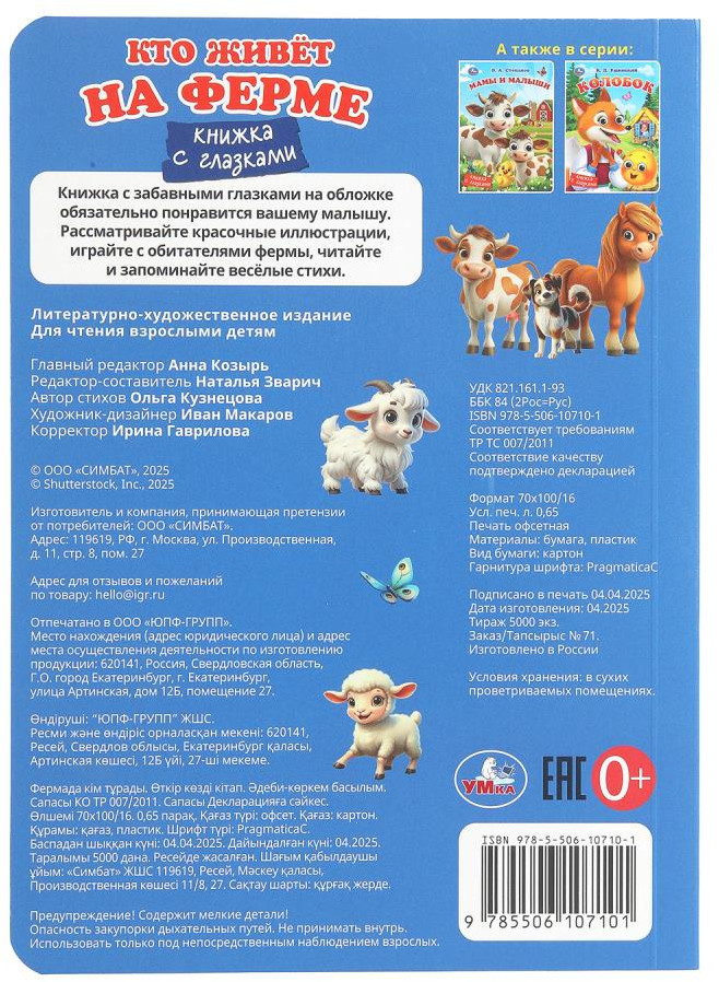 💳 Оплатить за товар можно при получении 🇰🇿 Есть бесплатная доставка по Казахстану 🎁 Копите бонусы с каждой покупки Книжка с глазками «Кто живёт на ферме» ТМ «УМка» непременно понравится малышу. На страницах этой яркой книги ребёнка ждёт встреча с милыми обитателями фермы. Короткие тексты о них сопровождаются большими красочными картинками с подвижными глазками, благодаря которым персонажи сказки выглядят совсем как живые. Компактный размер книги позволяет взять её с собой в путешествие. |
