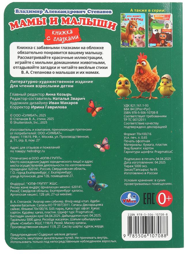 💳 Оплатить за товар можно при получении 🇰🇿 Есть бесплатная доставка по Казахстану 🎁 Копите бонусы с каждой покупки Книжка с глазками «В. А. Степанов. Мамы и малыши» ТМ «УМка» непременно понравится малышу. На страницах этой яркой книги ребёнка ждёт знакомство с милыми животными: мамами и их детёнышами. Интересные стихи Владимира Степанова сопровождаются большими красочными картинками с подвижными глазками, благодаря которым персонажи выглядят совсем как живые. Компактный размер книги позволяет взять её с собой в путешествие. |