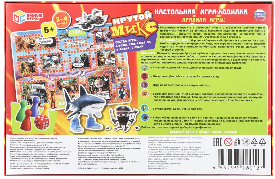 Настольная игра-ходилка «Крутой микс» подарит множество увлекательных минут весёлой игры вместе с забавными героями! Веселитесь и играйте в догонялки! Доберитесь первым до финиша, выполняя задания и используя тайные переходы. Бросайте кубик, весёлое приключение начинается прямо сейчас! Чтобы определить очерёдность хода, игроки бросают кубик. Первым ходит тот, у кого выпало наибольшее количество очков, дальше — по часовой стрелке. В процессе этой увлекательной игры участникам нужно бросать кубик и передвигать свои фишки по игровому полю на выпавшее количество ходов в любую сторону по направлению к финишу. На развилках игроки могут самостоятельно выбирать направление движения. В зависимости от поля, на котором остановится фишка, игрокам предстоит выполнять разные действия: двигаться по зелёной стрелке вперёд или возвращаться по красной назад; пропускать ход; повторно кидать кубик и смотреть, какой сюрприз ожидает в зависимости от того, сколько выпало очков; выполнять задание, расположенное внутри «комнаты», где находится фишка игрока — для победы необходимо выполнить 2 любых задания. Побеждает тот, кто первым доберётся до финиша. |