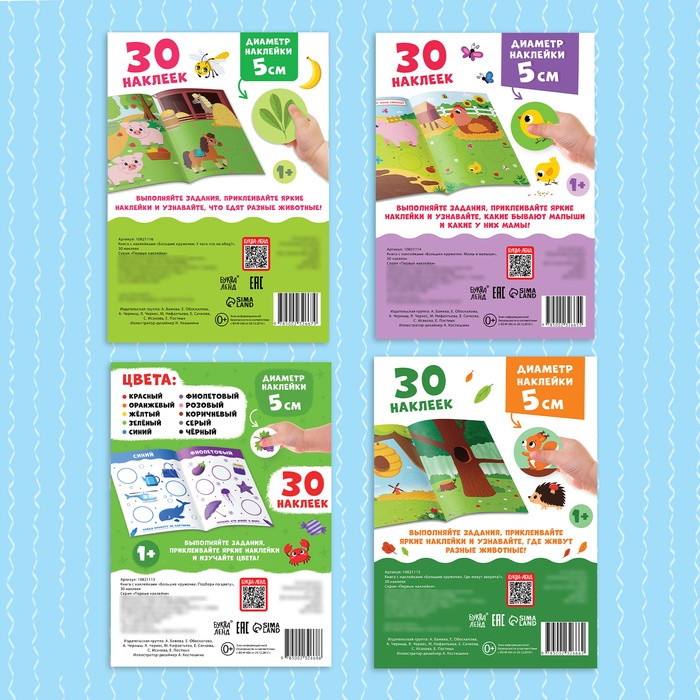 Набор книжек с большими наклейками-кружочками идеально подойдёт для увлекательных занятий с малышами от года. Простые задания с наклейками помогают ребёнку изучать окружающий мир, развивая навыки через игру.