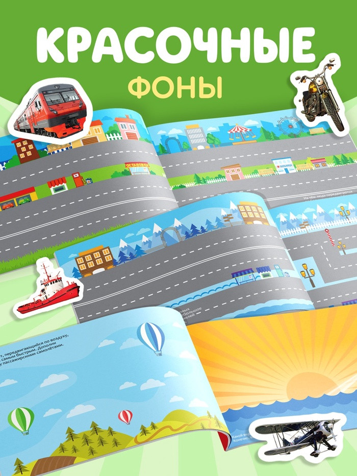 • в альбоме 12 страниц с заданиями, которые помогут ребёнку лучше познакомиться с разнообразными видами средств передвижения;