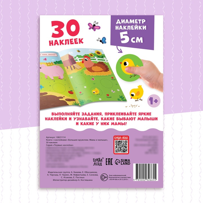 В данный момент этот товар отсутствует в продаже. Возможно, у нас найдется аналогичный или похожий товар здесь. Серия: Наклейки Книжка с большими наклейками-кружочками «Мамы и малыши» идеально подойдёт для увлекательных занятий с малышами от года. Простые задания с наклейками помогают ребёнку изучать окружающий мир, развивая навыки через игру.