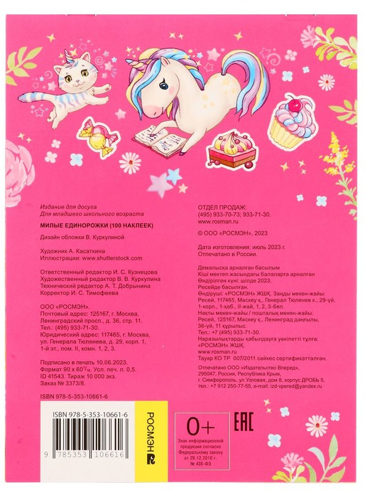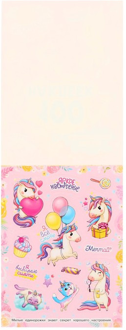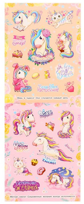 • на 8 страницах собраны уникальные наклейки с изображениями милых единорожек, дополненных нежными иллюстрациями и мотивирующими фразами;