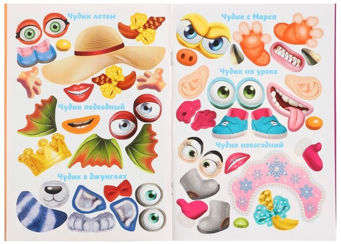 • 2 страницы ярких наклеек с глазами, носами, ушами и аксессуарами для создания уникальных персонажей;