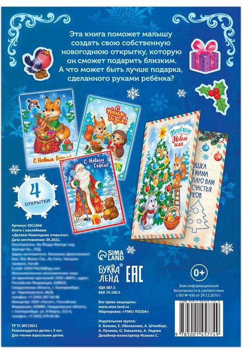 Книга с наклейками «Делаем новогодние открытки»новинка В данный момент этот товар отсутствует в продаже. Возможно, у нас найдется аналогичный или похожий товар здесь. Эта книга поможет малышу своими руками создать четыре новогодние открытки и подарить их близким. Такой подарок станет особенно ценным, ведь он сделан с любовью и фантазией ребёнка. Издание рекомендовано для детей от трёх лет и станет отличным занятием в преддверии праздника. |