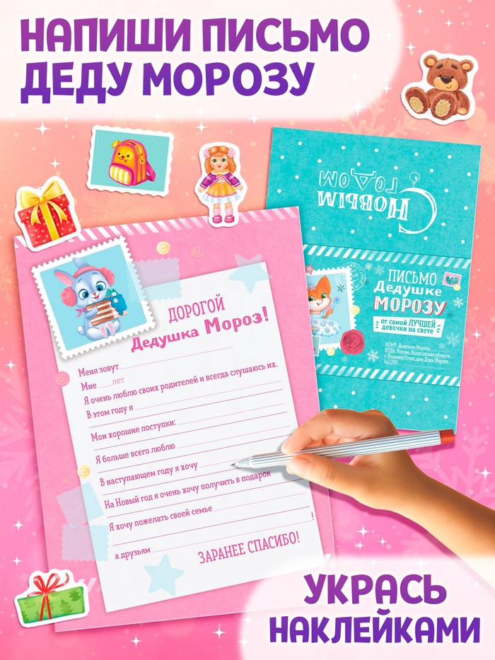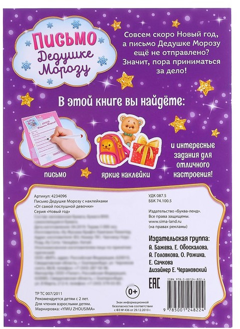 Письмо Дедушке Морозу с наклейками «От самой послушной девочки»новинка В данный момент этот товар отсутствует в продаже. Возможно, у нас найдется аналогичный или похожий товар здесь. Пришло время писать письмо Дедушке Морозу? В книжке малыш найдёт всё необходимое для этого. Дайте крохе лист из книги и оставьте его наедине, чтобы ребёнок смог написать все свои сокровенные желания. В книге есть много ярких наклеек, которыми малыш украсит своё письмо. После того как письмо будет готово, останется лишь вырезать конверт, запечатать его и отправить в Великий Устюг. Рекомендовано для детей от 3 лет. |