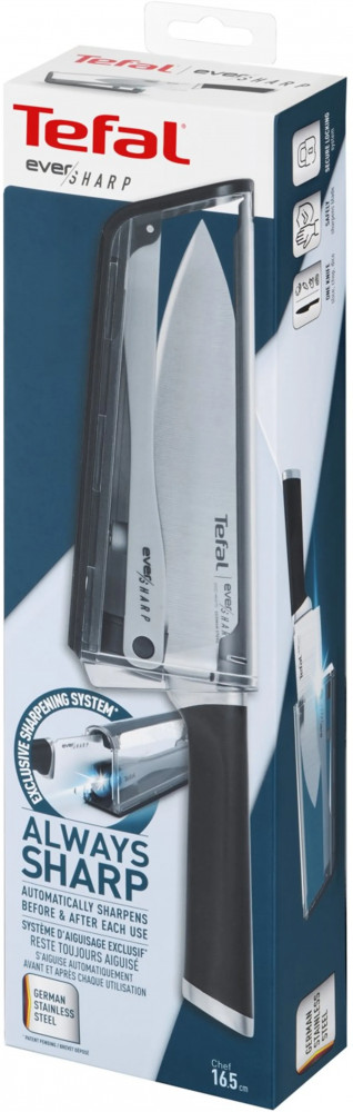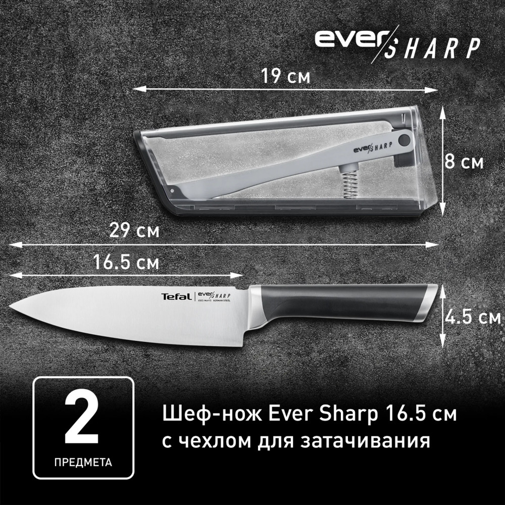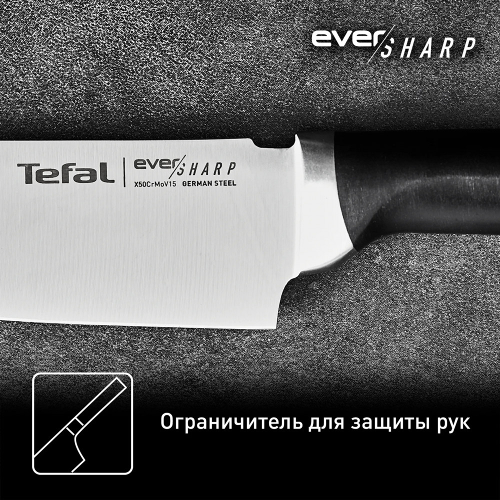 Поварской нож с чехлом для заточки Tefal Ever Sharp — это надежный и универсальный инструмент для работы на вашей кухне. Длина ножа 16.5 см идеально подходит для нарезки мяса, рыбы, овощей и других продуктов. Нож выполнен из премиальной немецкой стали X50Cr15MoV, что гарантирует долговечность, устойчивость к коррозии и высокую прочность лезвия. Острое лезвие легко справляется с любыми задачами на кухне, обеспечивая точность и аккуратность. Уникальный чехол для заточки автоматически затачивает нож по всей длине лезвия при каждом использовании, что позволяет всегда поддерживать нож в идеальном состоянии. Система блокировки надежно фиксирует нож в чехле, а разборный чехол легко очищается. Эргономичная рукоять обеспечивает комфортное использование и предотвращает скольжение пальцев. Ограничитель для защиты рук помогает обезопасить процесс работы с ножом. Серия Ever Sharp — это инновационное решение для кухни, которое сочетает в себе удобство, надежность и высокое качество, делая каждый процесс нарезки легким и комфортным.