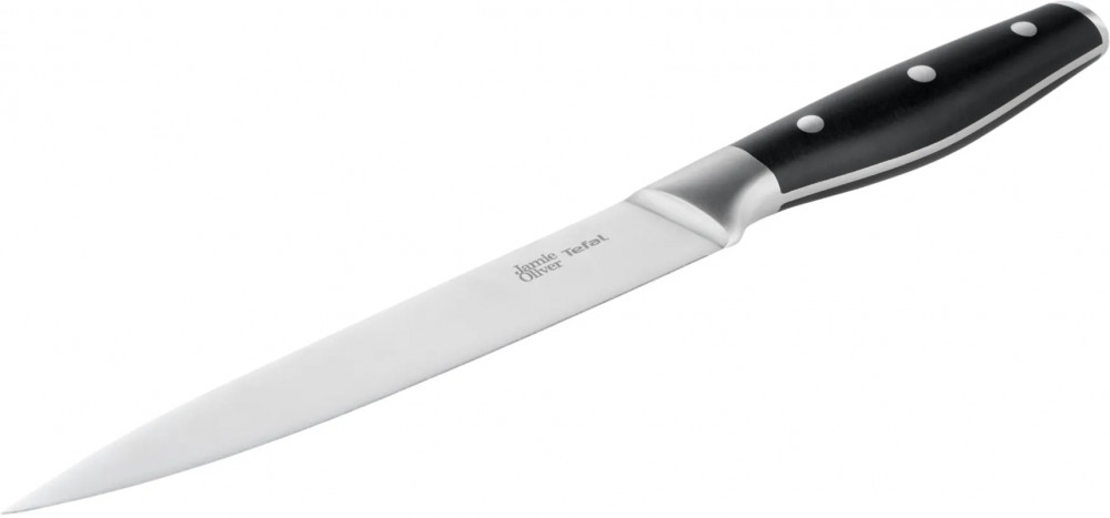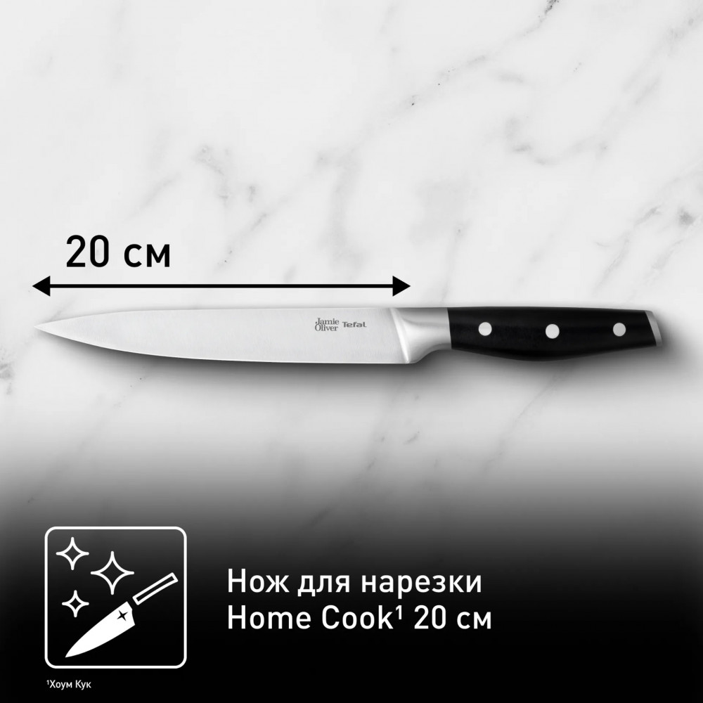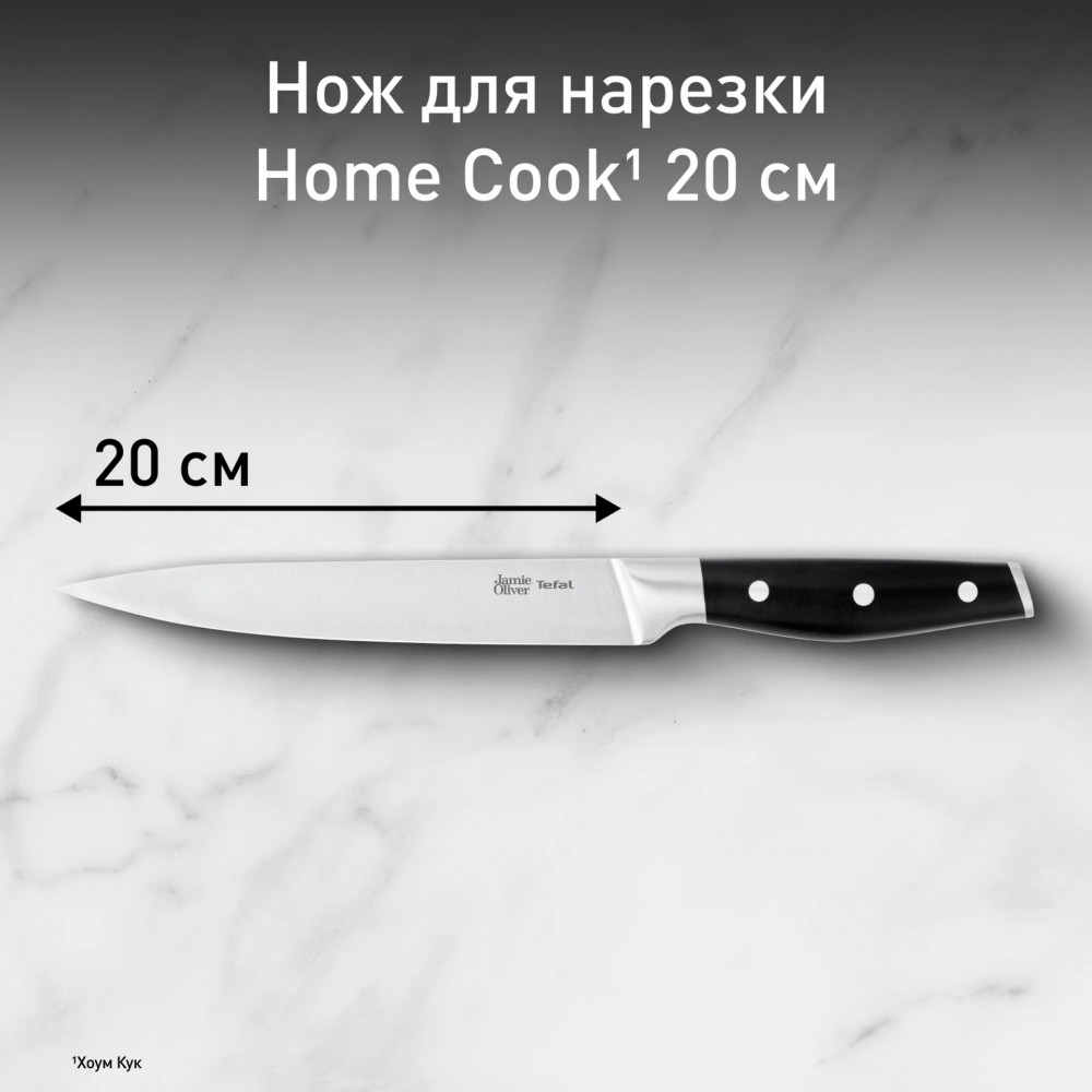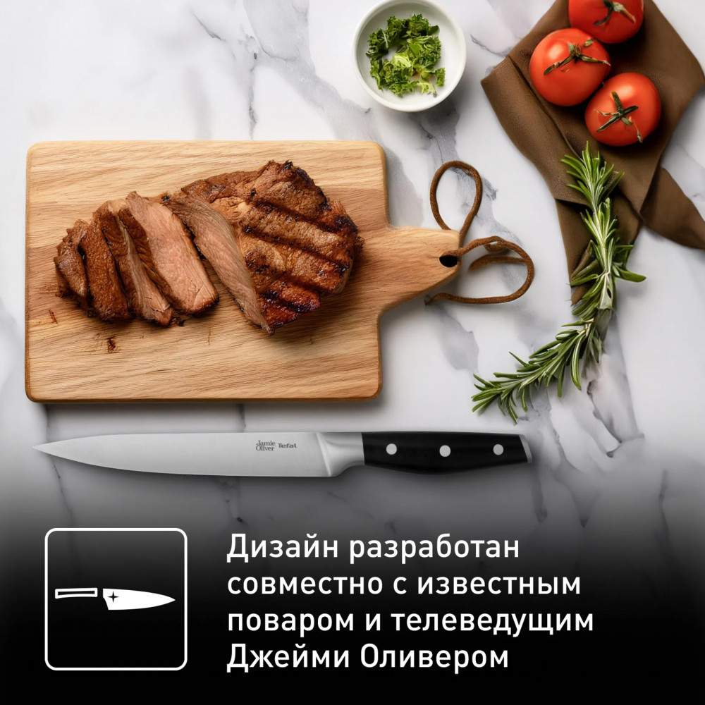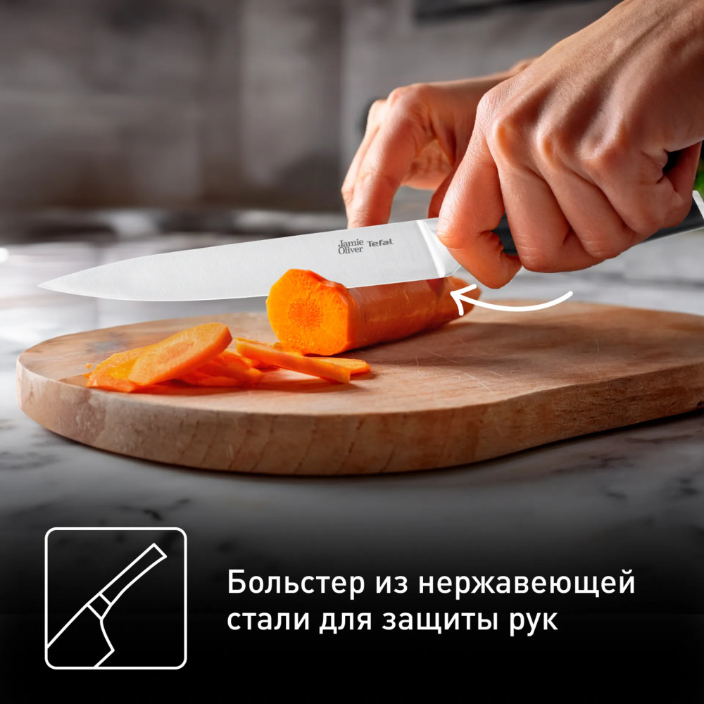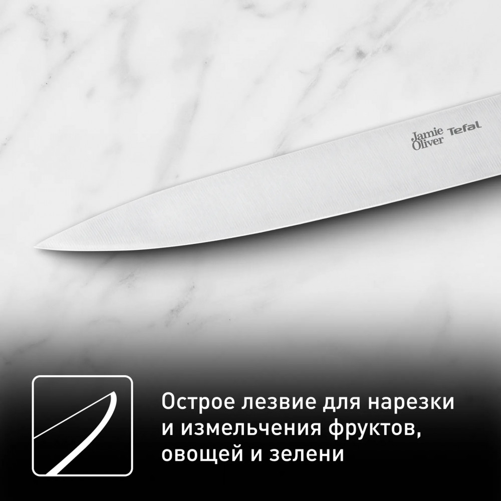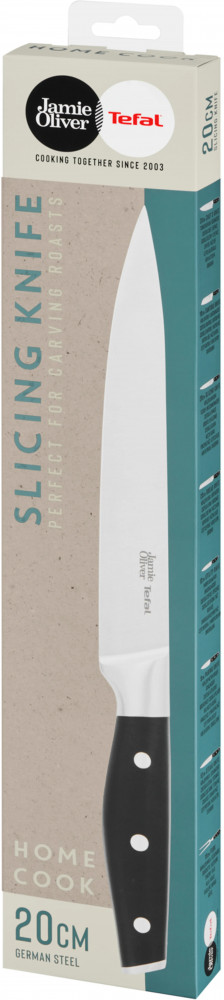 Универсальный нож Tefal Jamie Oliver Home Cook — это нож с универсальным лезвием, идеально подходящий для нарезки, шинковки и очистки различных продуктов. Длина ножа 20 см позволяет легко справляться с любыми задачами на кухне. Лезвие выполнено из премиальной немецкой нержавеющей стали X50Cr15MoV, что гарантирует долговечность и стойкость к повреждениям. Идеально острое лезвие обеспечивает точные и аккуратные срезы при нарезке мяса, рыбы, овощей или фруктов. Эргономичная рукоять с заклепками гарантирует комфорт при использовании, а больстер из нержавеющей стали обеспечивает надежность и безопасность. Дизайн ножа был разработан совместно с известным шеф-поваром и телеведущим Джейми Оливером, что делает его не только функциональным, но и стильным аксессуаром на вашей кухне.