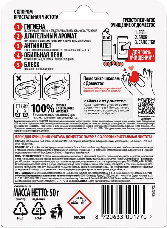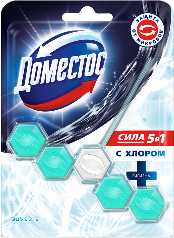 Блок гигиенический для унитаза Доместос «Сила 5 в 1: Кристальная чистота» против известкового налета и неприятного запаха — это пять преимуществ, помогающих обеспечить защиту от загрязнений и микробов и сохранить чистоту и блеск. При каждом смывании появляется яркий аромат морозной свежести на срок до 4 часов и обильная пена, которая борется с налетом, поддерживая гигиену и блеск поверхности унитаза.Блок для туалета Доместос содержит активное вещество, которое под действием напора воды ополаскивает всю поверхность унитаза, защищая от бактерий и помогая предотвращать известковый налет.