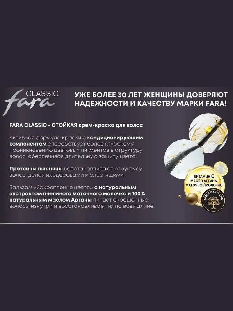 Fara — профессионал в области окрашивания и ухода за волосами. Вот уже более 20 лет женщины доверяют надежности и качеству марки. Все продукты Fara проходят строгий контроль качества. |