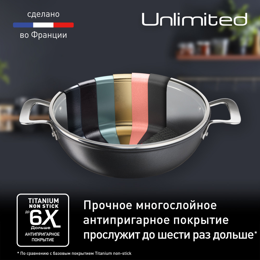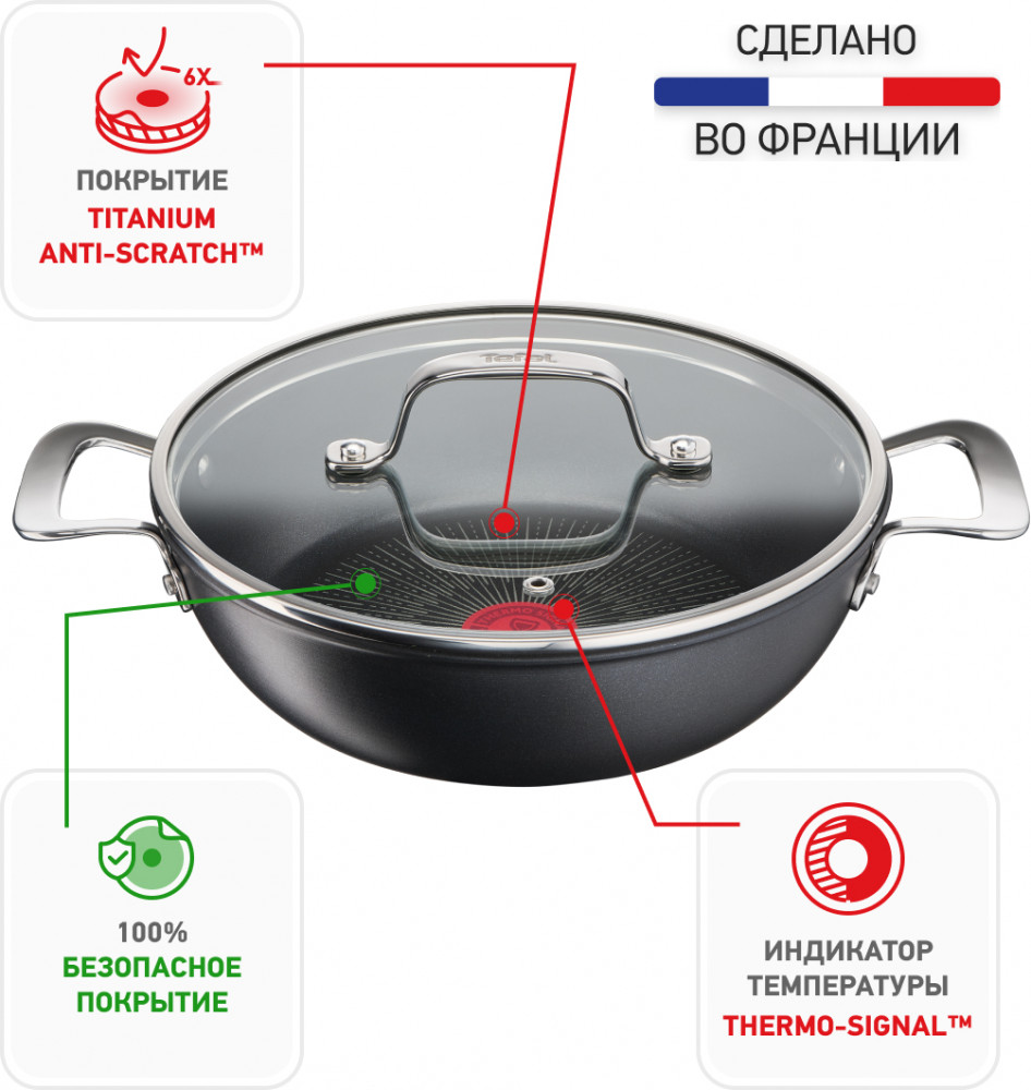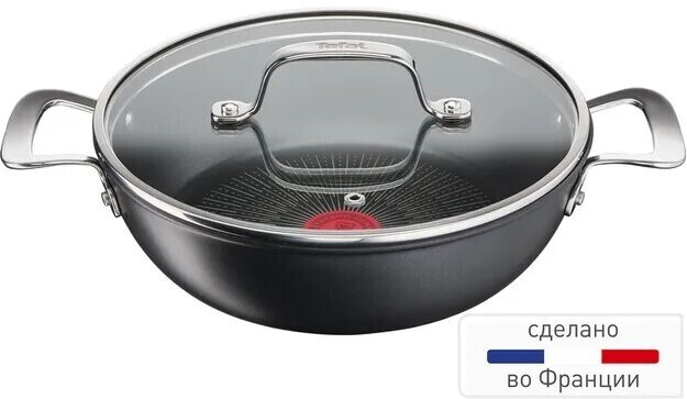 Здоровое и безопасное приготовление пищи. Сковорода очень быстро нагревается, а большая поверхность и соответствующая толщина термоплавкого дна обеспечивают равномерное распределение тепла. Это гарантия идеально приготовленных блюд. Благодаря антипригарному покрытию внутри и снаружи готовить удобно, а мыть очень быстро. Индикатор становится ярко-красным, когда сковорода достаточно нагрета для жарки. Благодаря этому вы получаете идеальную текстуру, цвет и вкус ваших блюд, сохраняя при этом максимальную питательную ценность. Откройте для себя самое прочное антипригарное покрытие с максимальной устойчивостью к царапинам, которое до 6 раз прочнее стандартного покрытия Tefal.