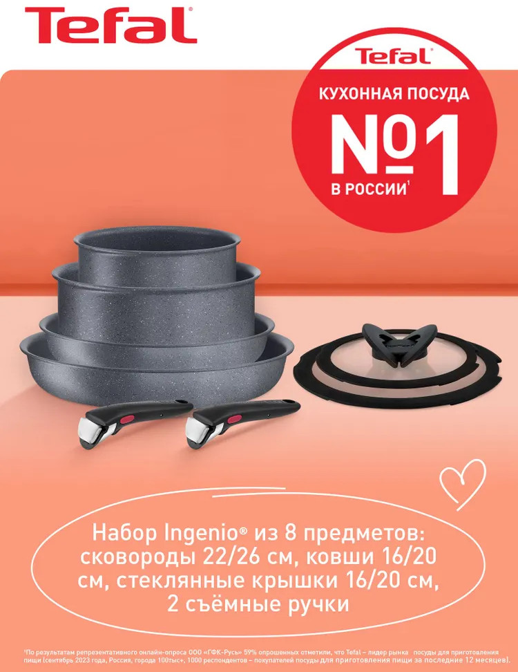 Набор посуды для кухни Tefal «Ingenio Natural Force» — это компактное и практичное решение для современной кухни. В его состав входят большая и маленькая сковороды 22, 26 см, ковшики 16, 20 см, стеклянные крышки и 2 съёмные ручки с трёхточечной системой фиксации, выдерживающие до 10кг — они позволяют легко перемещать все элементы из комплекта от плиты к духовке, холодильнику и обратно. Металлическая посуда Тефаль изготовлена из алюминия и имеет антипригарное покрытие Mineralia+, обогащённое минералами. Это покрытие обеспечивает высокую износостойкость и возможность приготовления без добавления лишнего масла. Индикатор Thermo-Signal предупреждает о достижении оптимальной температуры нагрева, гарантируя идеальный старт жарки.