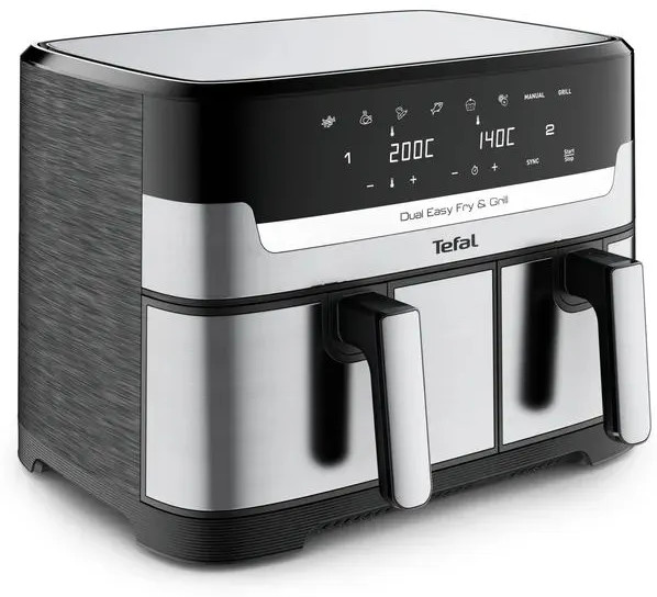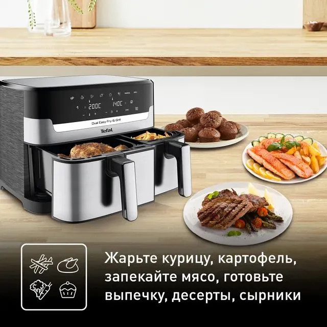 Серия: Easy Fry & Grill Digital Аэрогриль Tefal EY905D10 — устройство с двумя чашами общей емкостью 8,3 л и мощностью 2700 Вт. Восемь автоматических программ — предустановленные режимы позволяют жарить и запекать продукты без необходимости вручную подбирать время и температуру. Сенсорное управление — интуитивно понятный интерфейс помогает легко настраивать нужные параметры приготовления. Антипригарное покрытие поддона и корзины. Предотвращает прилипание пищи, облегчает процесс готовки и упрощает очистку устройства. Таймер — озволяет установить нужное время приготовления, гарантирует полный контроль над процессом. Съемные чаши аэрогриля можно мыть в посудомоечной машине. Их можно использовать вместе или по отдельности. |