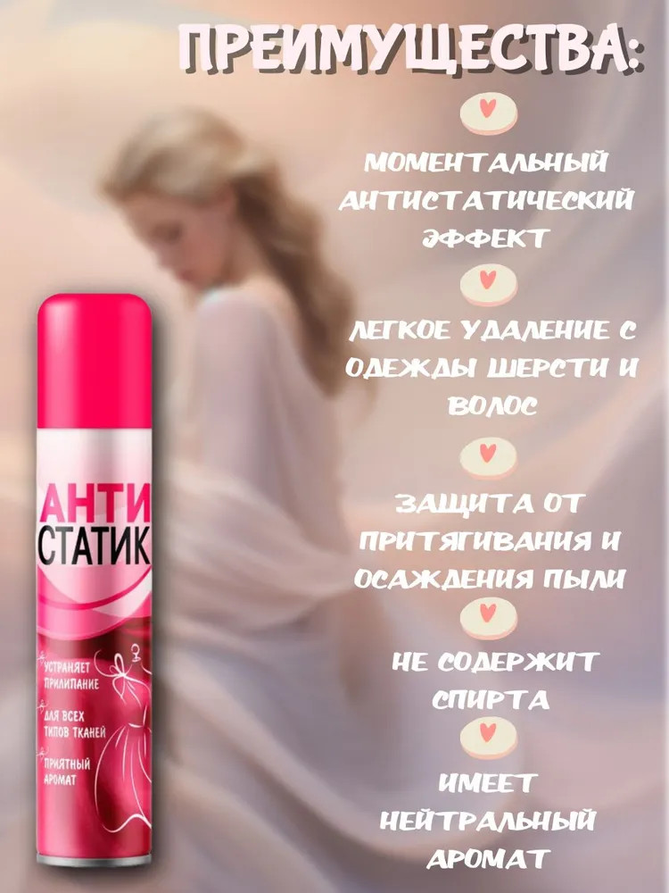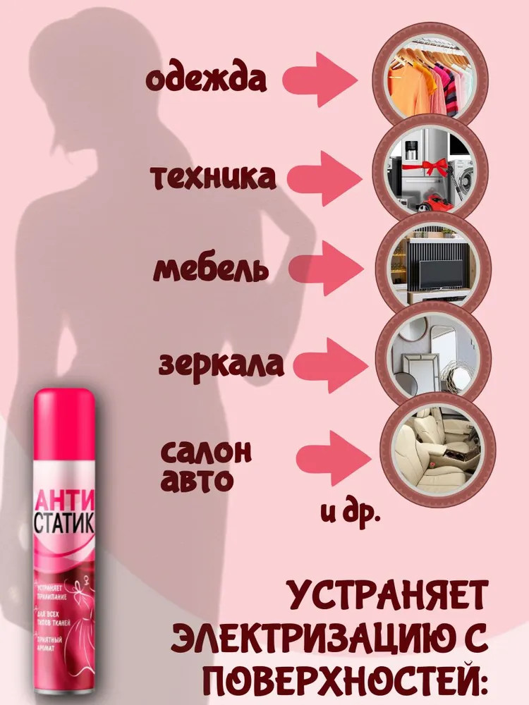 Спрей Антистатик для одежды, мебели, техники, полимерных и пластиковых покрытий, а также является незаменимым аксессуаром для салона автомобиля, стекол и зеркал. Революционная, эффективная формула надежно снимает статическое электричество и защищает поверхность от пыли, притягивания шерсти и ворсинок. Абсолютно гипоаллергенен и безопасен, не содержит токсичных или раздражающих компонентов. Чистящее средство антисептик подходит для всех типов тканей, не повреждает ее структуру, не оставляет разводов и следов. Идеально подойдет для одежды, мебели, ковров, штор, а также для шерсти и шерстяных изделий. Надежно защитит технику экран телевизора, смартфона, ноутбука или планшета, а также пластиковые поверхности дома или в автомобиле от притягивания пыли и прилипания ворса. Предотвратит прилипание одежды к телу. Экономичен в использовании. Обладает пролонгированным антисептическим действием и защищает поверхности не только пыли, но и от других загрязнений.