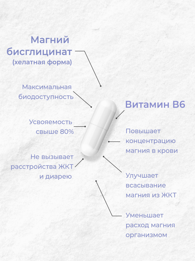 Витаминно-минеральный комплекс глицинат Магний Б6 400мг для взрослых представляет собой соединение с аминокислотой, которая доставляет нутриент в клетки и ткани. Такая структура обеспечивает высокую биодоступность и щадящее воздействие на ЖКТ.