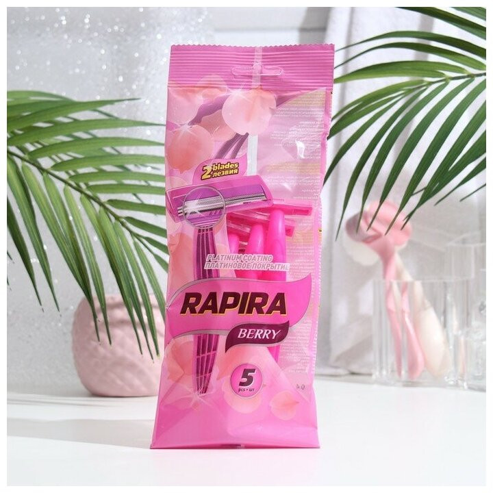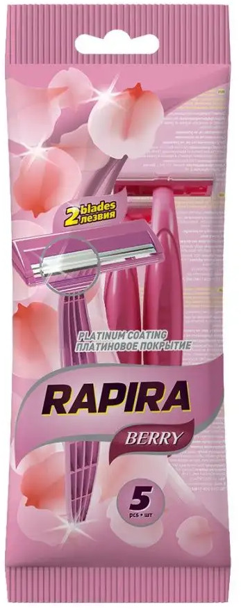Rapira Berry — одноразовые бритвы из высококачественной стали. 2 лезвия покрытые платиновым напылением. В упаковке 5 штук. |