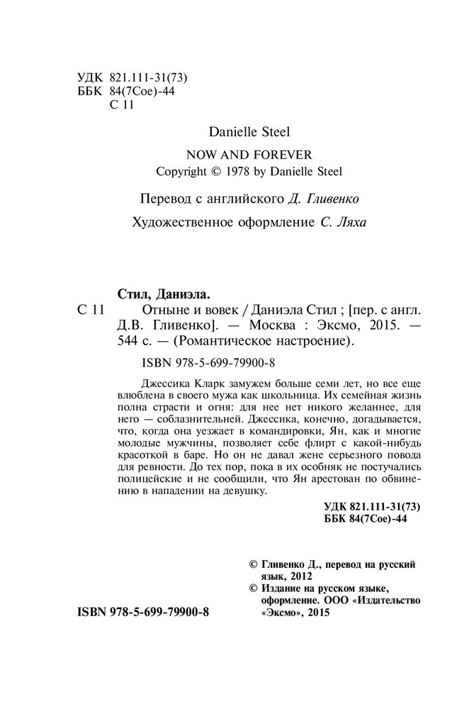 Отныне и вовекВ данный момент этот товар отсутствует в продаже. Возможно, у нас найдется аналогичный или похожий товар здесь. Серия: Романтическое настроение Джессика Кларк замужем больше семи лет, но все еще влюблена в своего мужа, как школьница. Их семейная жизнь полна страсти и огня: для нее нет никого желаннее, для него - соблазнительней. Джессика, конечно, догадывается, что, когда она уезжает в командировки, Ян, как и многие молодые мужчины, позволяет себе флирт с какой-нибудь красоткой в баре. Но он не давал жене серьезного повода для ревности. До тех пор, пока в их особняк не постучались полицейские и не сообщили, что Ян арестован по обвинению в нападении на девушку. |