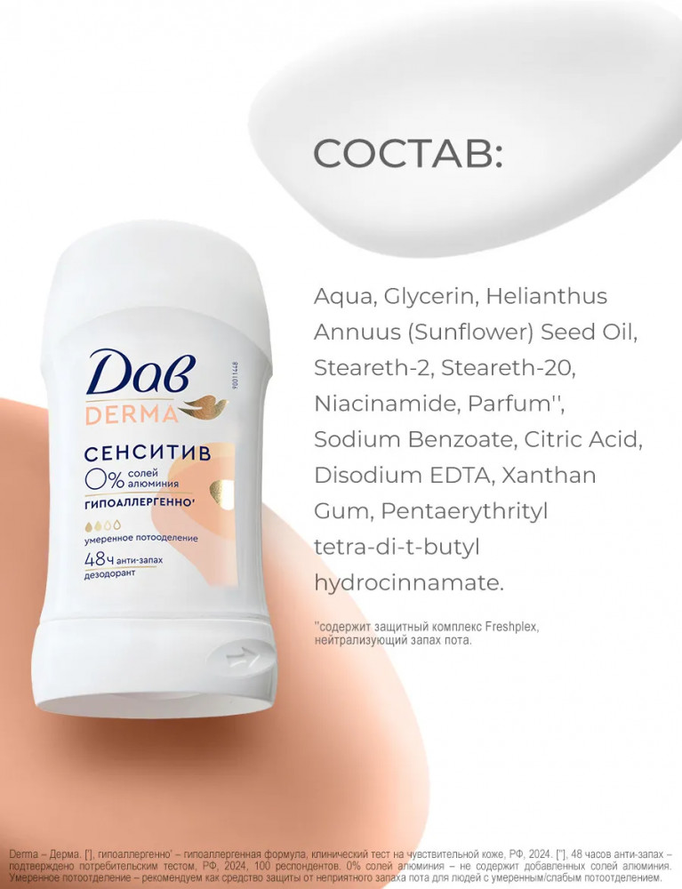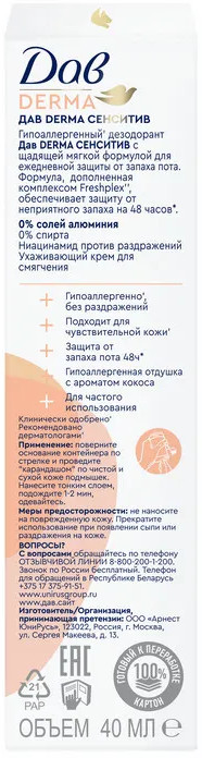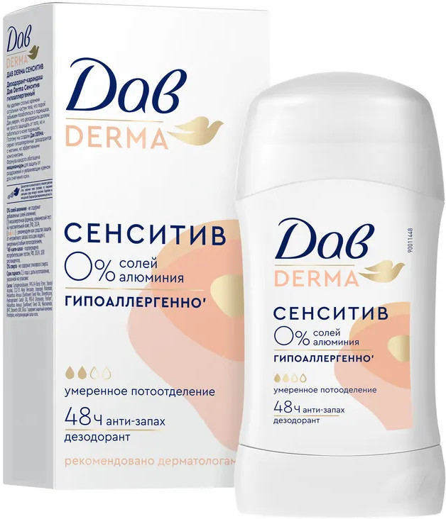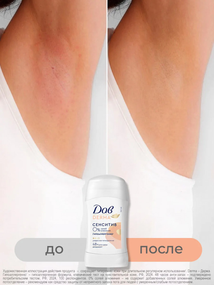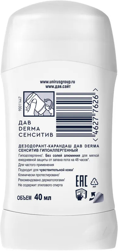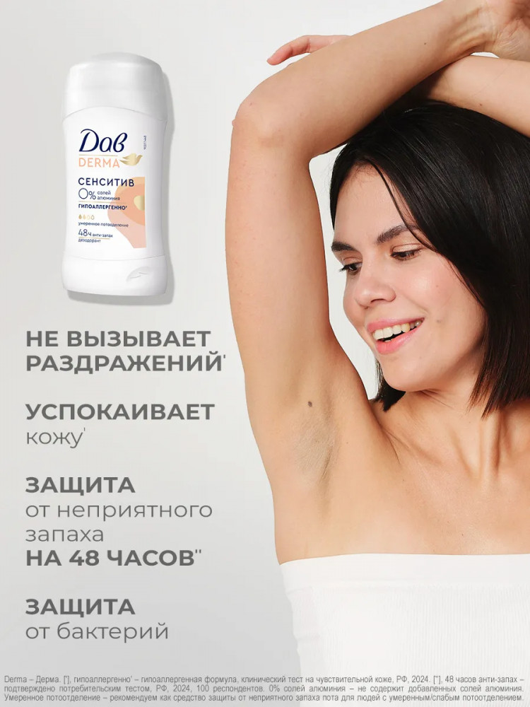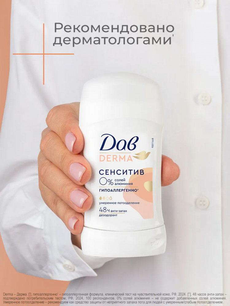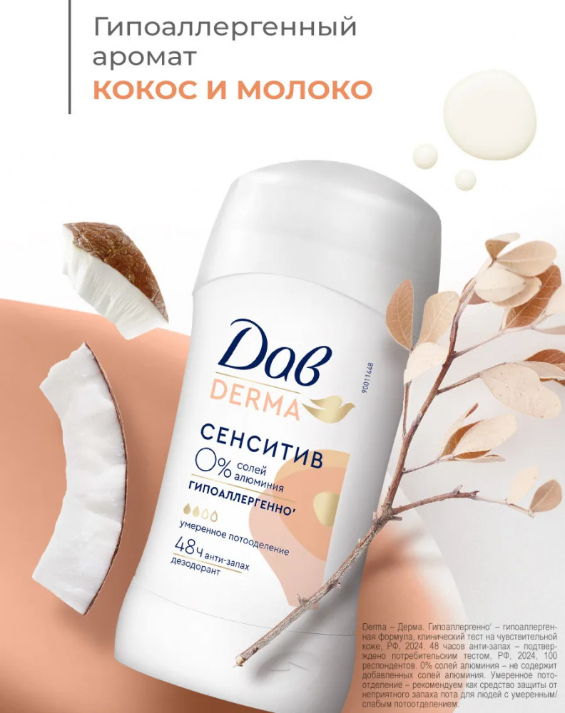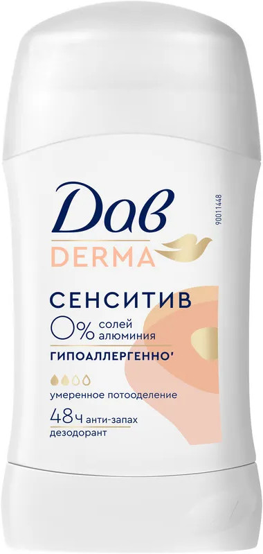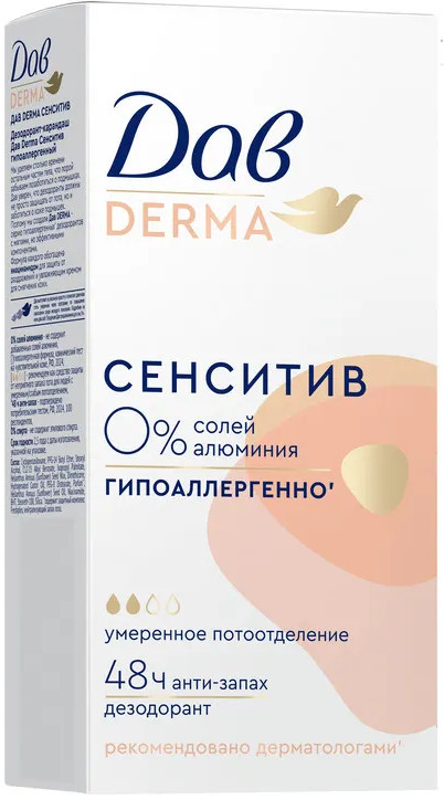 Гипоаллергенный’ дезодорант-стик Дав Derma разработан специально для женщин, которые ценят ощущение комфорта и длительную защиту от запаха пота на протяжении всего дня. Благодаря своей безопасной формуле дезодорант подходит для женщин, а также девушкам и даже девочкам-подросткам, бережно заботясь о коже во время активных изменений в организме. Этот продукт эффективно предотвращает появление запаха пота и обеспечивает коже длительное ощущение свежести благодаря своей мягкой щадящей формуле. Женский дезодорант твердый стик не содержит солей алюминия и спирта, что делает его идеальным выбором для нежной и чувствительной кожи’. В формулу продукта входит ухаживающий крем, необходимый для смягчения кожи.