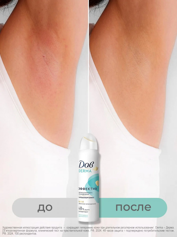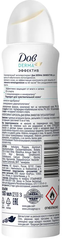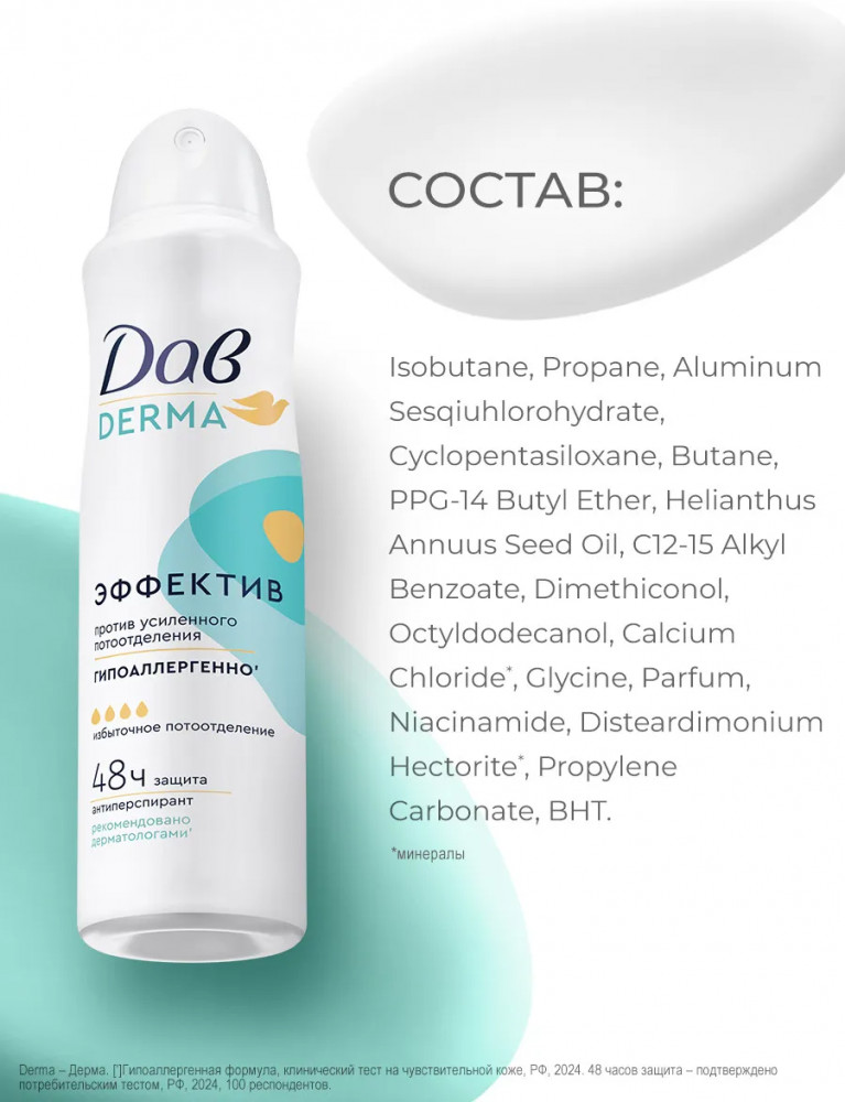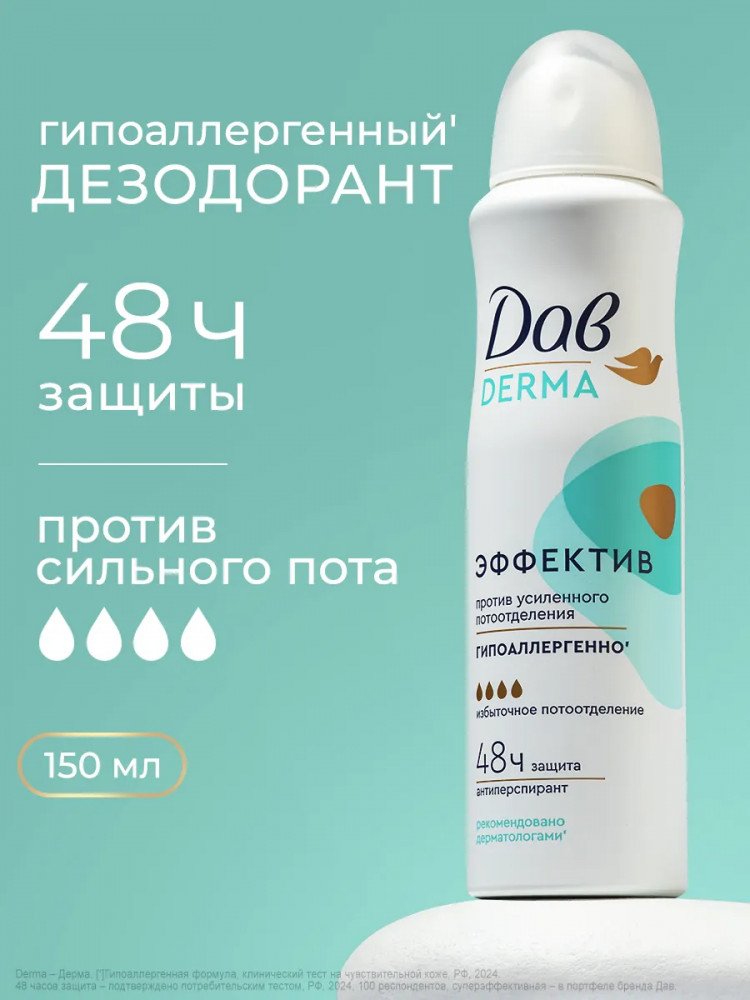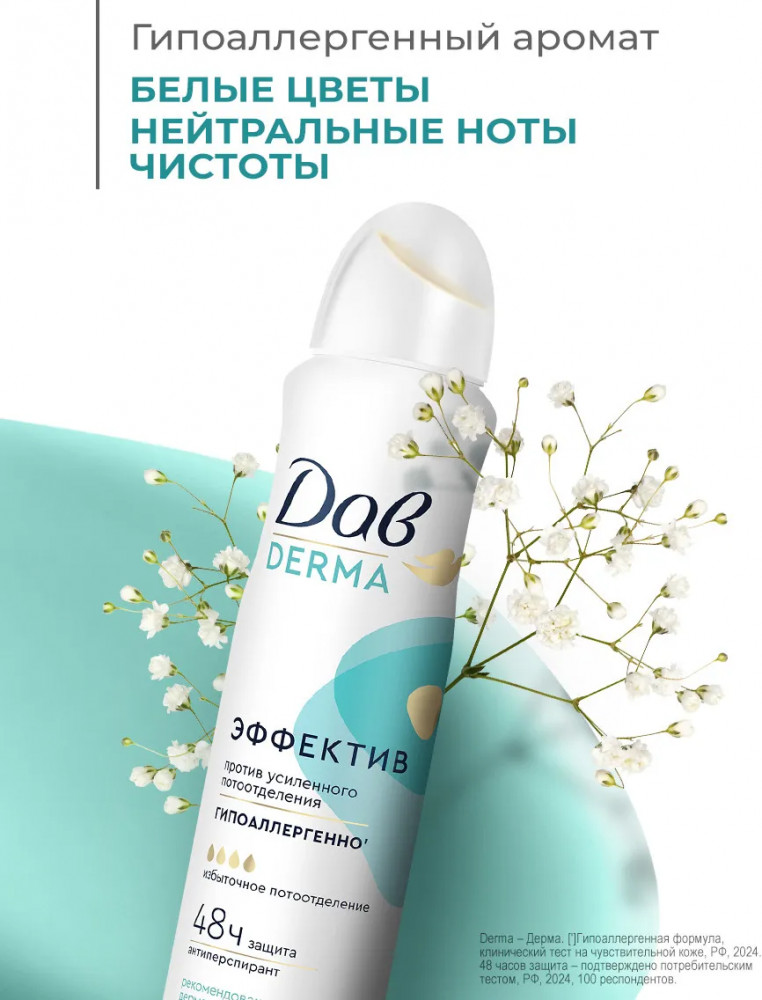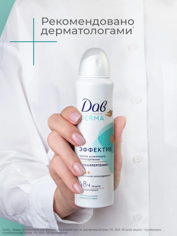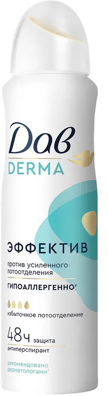 Гипоаллергенный’ дезодорант-спрей Дав Derma разработан специально для женщин, которые ценят ощущение комфорта и длительную защиту от запаха пота на протяжении всего дня. Благодаря своей безопасной формуле дезодорант подходит для женщин, а также девушкам и даже девочкам-подросткам, бережно заботясь о коже во время активных изменений в организме. Этот продукт эффективно предотвращает появление запаха пота и обеспечивает коже длительное ощущение свежести благодаря своей мягкой щадящей формуле. Женский дезодорант не содержит солей алюминия и спирта, что делает его идеальным выбором для нежной и чувствительной кожи’. В формулу продукта входит ухаживающий крем, необходимый для смягчения кожи.