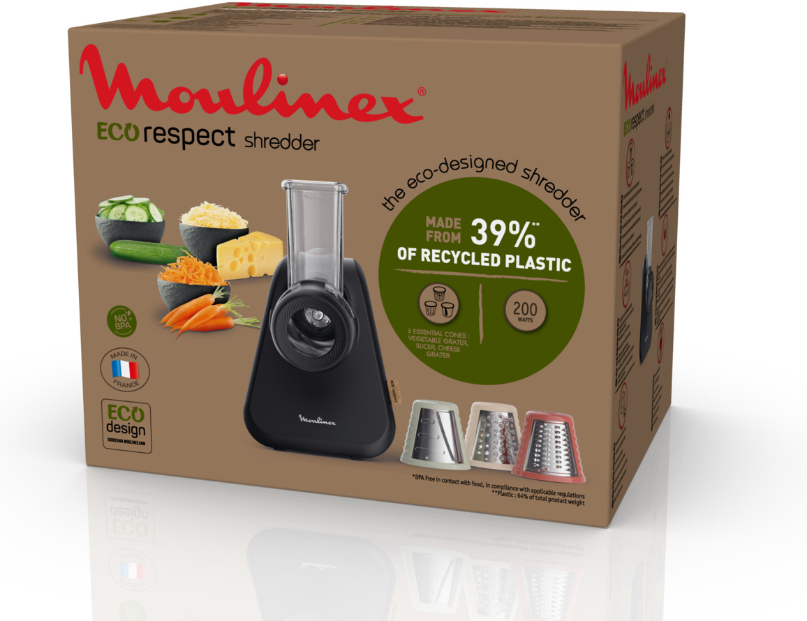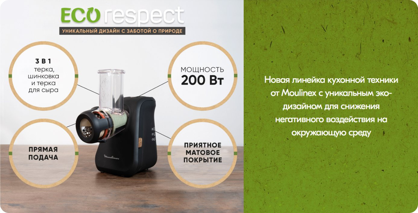 Серия: Eco Respect Серия Eco Respect — первая коллекция продукции для приготовления пищи с эко-дизайном, разработанная специально для снижения негативного воздействия на окружающую среду. Овощерезка изготовлена во Франции на 39% из перерабатываемого пластика (пластик составляет 49% от общего веса устройства) и поставляется в экоупаковке (подробности см. ниже). В дополнение она не содержит BPA*, пригодна для вторичной переработки на 87%, а также ремонтопригодна в течение 10 лет. Овощерезка Moulinex Eco Respect — это удобное устройство, которое поможет легко приготовить овощи, благодаря функции 3в1: шинковка, измельчение и терка. Откройте для себя ключ к приготовлению любимых рецептов: вкусных салатов, овощных оладий, картофельных драников и многого другого. |