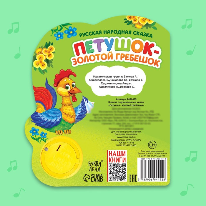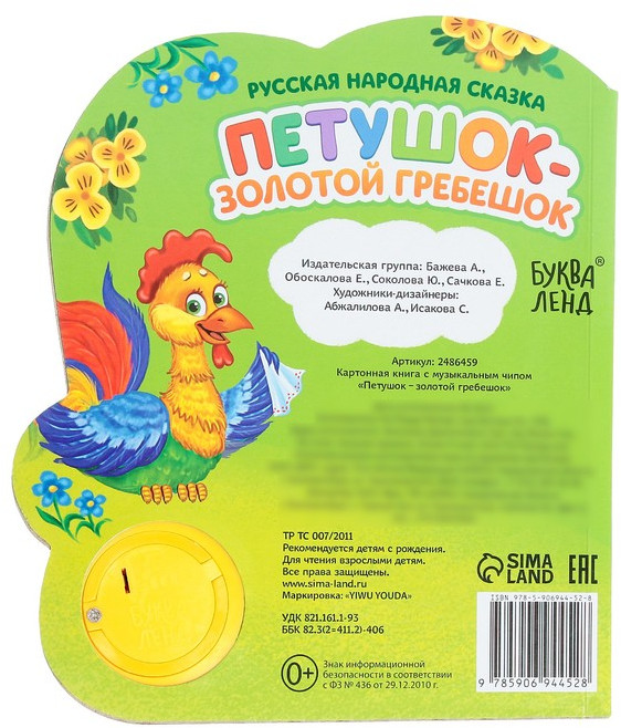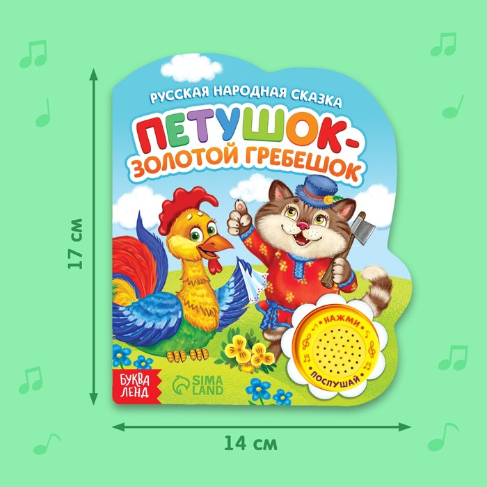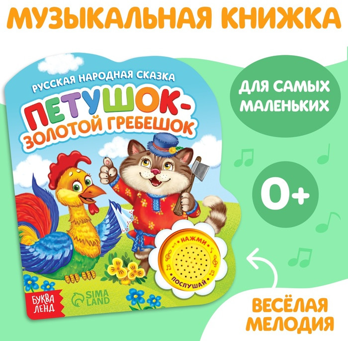Петушок-золотой гребешок. Музыкальная книга-сказкановинка В данный момент этот товар отсутствует в продаже. Возможно, у нас найдется аналогичный или похожий товар здесь. Серия: Музыкальные книги Серия музыкальных книг со сказками познакомит малыша с известными героями. Читайте вместе с ребёнком волшебные истории и слушайте весёлую песенку. Страницы книги выполнены из плотного картона. Музыкальный чип работает от батареек, входят в комплект. Продолжительность песенки: 20–25 секунд. Рекомендуем не мочить книгу, чтобы страницы не рассохлись. Издание подходит малышам с рождения. Для чтения взрослыми детям. |
