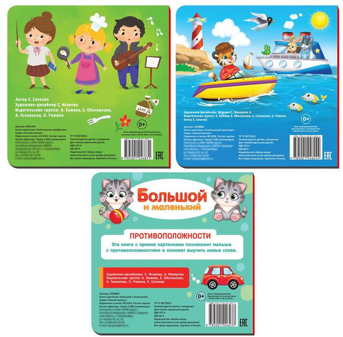 В данный момент этот товар отсутствует в продаже. Возможно, у нас найдется аналогичный или похожий товар здесь. Серия: Мои первые книжки Набор картонных книг «Про всё на свете» включает 3 красочные книги по 10 страниц каждая, которые познакомят малыша с разнообразными темами: профессии, большой-маленький и транспорт. Эти увлекательные издания формата квадрат с твёрдым переплётом станут идеальным выбором для детей с первых месяцев жизни.