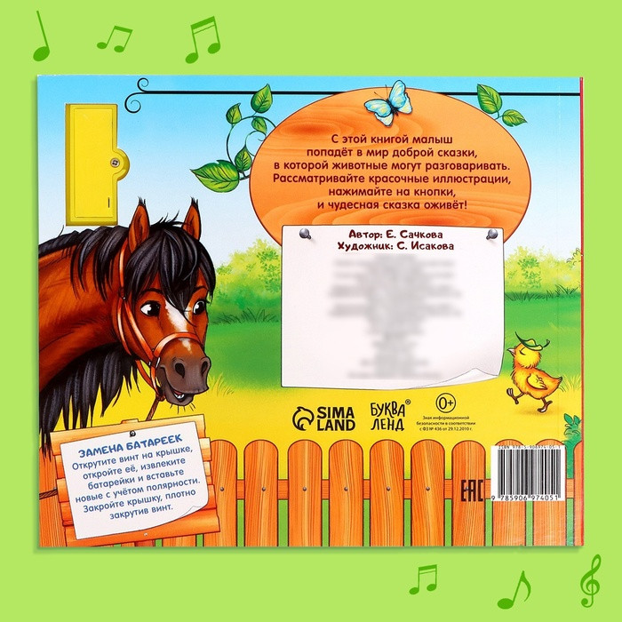 Телёнок ищет маму. Музыкальная книгановинка В данный момент этот товар отсутствует в продаже. Возможно, у нас найдется аналогичный или похожий товар здесь. Серия: Музыкальные книги Эту музыкальную сказку интереснее всего исполнять по ролям. Задача взрослого — читать текст, а задача малыша — нажимать на изображение животного на музыкальном блоке, как только картинка с ним попадётся в тексте. Когда кроха подрастёт и научится читать, поменяйтесь с ним ролями. Страницы книги сделаны из плотного гладкого картона. Звуковой чип работает от батареек, входят в комплект. Издание подходит малышам с рождения. Для чтения взрослыми детям. |