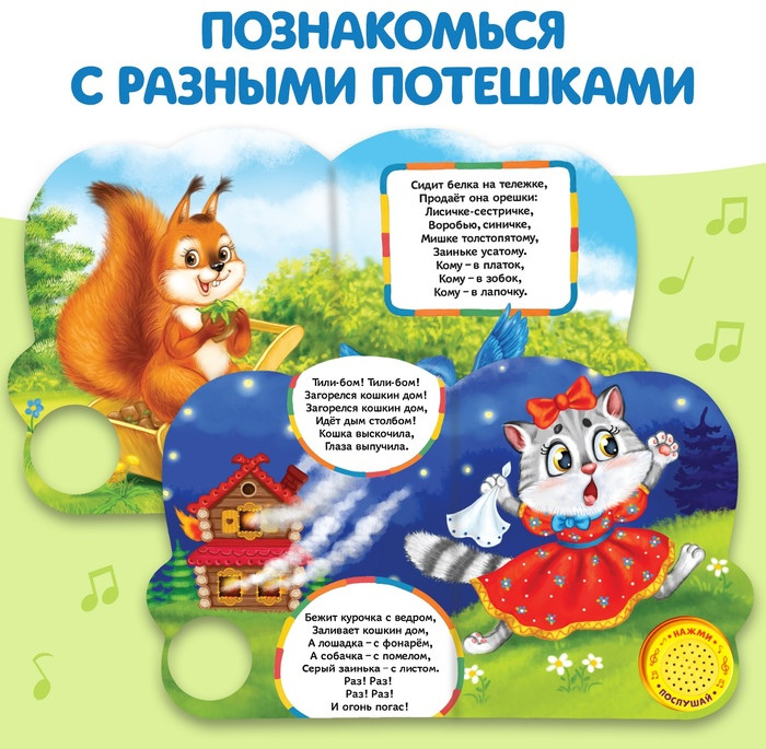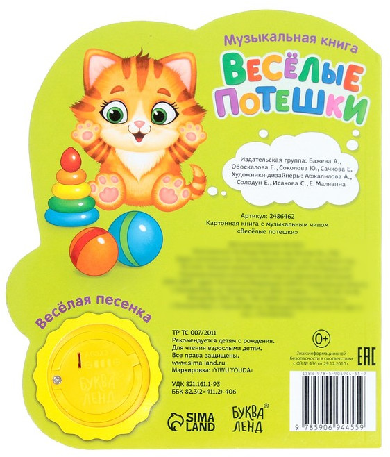 Весёлые потешки. Музыкальная книгановинка В данный момент этот товар отсутствует в продаже. Возможно, у нас найдется аналогичный или похожий товар здесь. Серия: Музыкальные книги Красочная книга познакомит ребёнка с милыми животными. Читайте вместе с малышом потешки, повторяйте за героями и подпевайте весёлой песенке. Страницы книги выполнены из плотного картона. Музыкальный чип работает от батареек, входят в комплект. Продолжительность песенки: 20–25 секунд. Рекомендуем не мочить книгу, чтобы страницы не рассохлись. Издание подходит малышам с рождения. Для чтения взрослыми детям. |