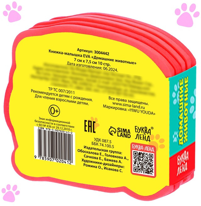 Мягкая книжка-малышка «Домашние животные»новинка В данный момент этот товар отсутствует в продаже. Возможно, у нас найдется аналогичный или похожий товар здесь. Мягкая книга изготовлена из приятного на ощупь пористого материала ЭВА, поэтому подходит для детей с рождения. На каждой странице приклеены яркие иллюстрации с милыми персонажами, а отсутствие острых углов и лёгкий вес делают её полностью безопасной для самых маленьких. Контуры книги повторяют форму героя на обложке, а объёмная голова животного помогает заинтересовать ребёнка и привлечь внимание к истории. Рекомендуется не мочить книгу, так как картон, приклеенный на ЭВА-основу, невлагостойкий. |