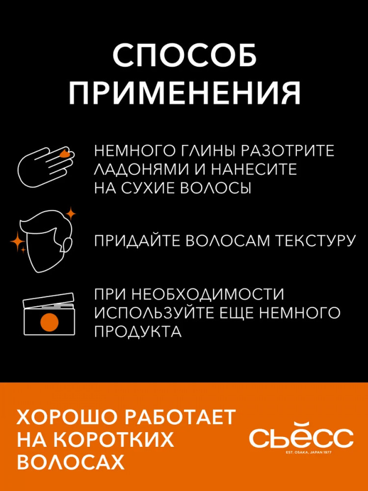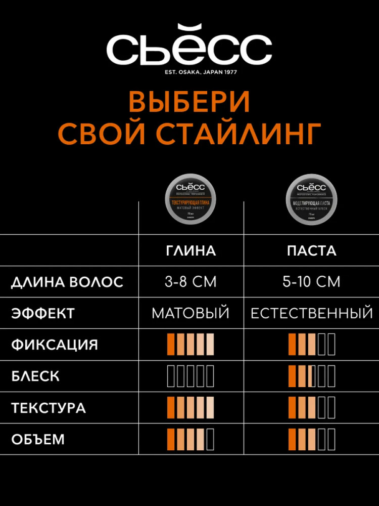 Природная текстура и стильный матовый эффект с глиной Сьесс! Нашей новой разработкой стала уникальная текстурирующая глина для волос, созданная профессиональными экспертами марки Сьесс. Этот продукт объединяет силу моделирующей пасты и великолепие натурального блеска, способствуя созданию современных и креативных укладок. |