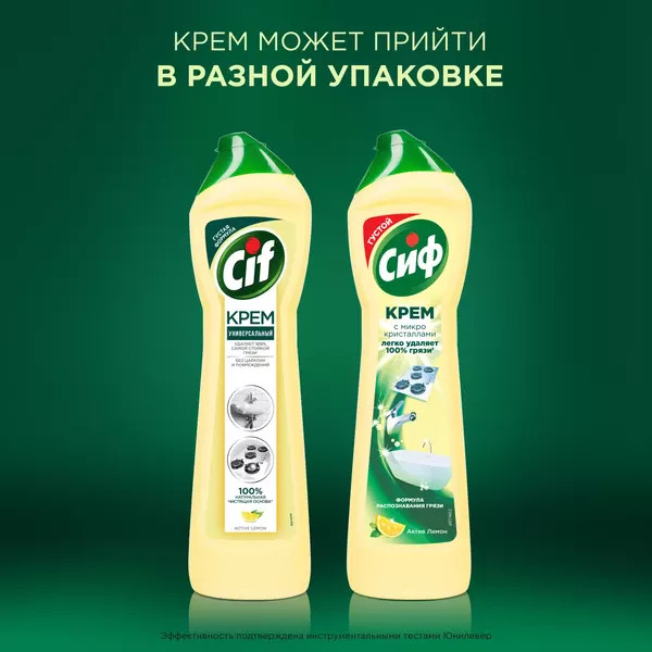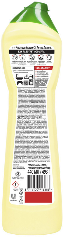 Устали от известкового налета? Не можете удалить пятна в ванной или на кухне? Не нравятся царапины после уборки? Густой чистящий крем Сиф Актив Лимон 100% удалит грязь на кухне и в ванной, оставляя поверхности 100% сияющими и гладкими. Крем удаляет грязь благодаря силе микрокристаллов, которые помогают добиться чистых, сияющих и гладких поверхностей. Легко нанести, легко протереть, легко смыть. Крем проникает и полностью удаляет такие въевшиеся и застарелые загрязнения, как засохший жир, пригоревшая еда, мыльные разводы и известковый налет. Притом, он не царапает поверхность и обладает приятным свежим лимонным запахом.