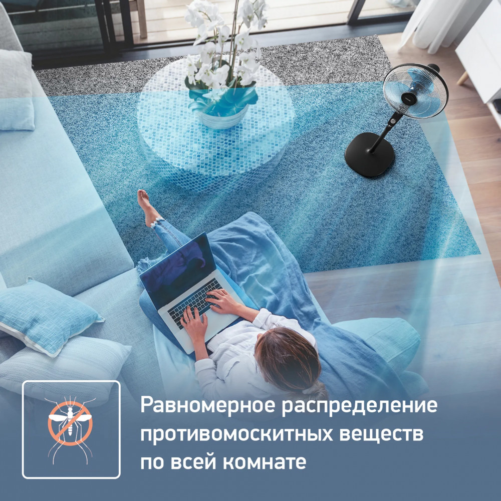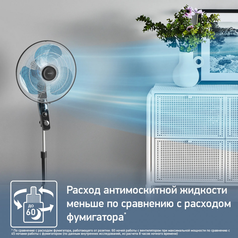 Вентилятор Tefal Essential + обеспечивает мощное охлаждение на максимальной скорости и надежную защиту от комаров — почти вдвое эффективнее, чем классический антимоскитный диффузор без вентилятора. Наслаждайтесь эффектом свежести, оставаясь без комаров! Надежная защита от комаров до 2 месяцев при использовании всего одного флакона противомоскитной жидкости. Мощный воздушный поток обеспечивает равномерное распределение противомоскитных веществ по всей комнате, действуя эффективнее классического диффузора без вентилятора. Настройте работу вентилятора для комфортного охлаждения вашего дома. Устройство удобно регулируется по высоте для обдува на том уровне, который комфортен для вас и ваших близких. Удобная длина провода позволяет установить вентилятор в любой точке дома.