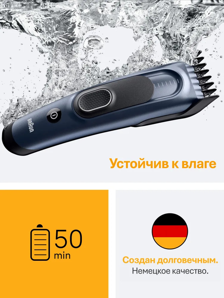 Машинка для стрижки волос Braun полностью моющаяся — легкость очистки под проточной водой. Машинка автоматически приспосабливается к любому напряжению от 100 до 240 В. Это делает ее идеальным спутником в поездках.
