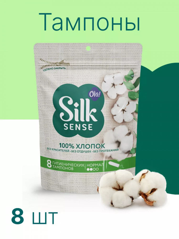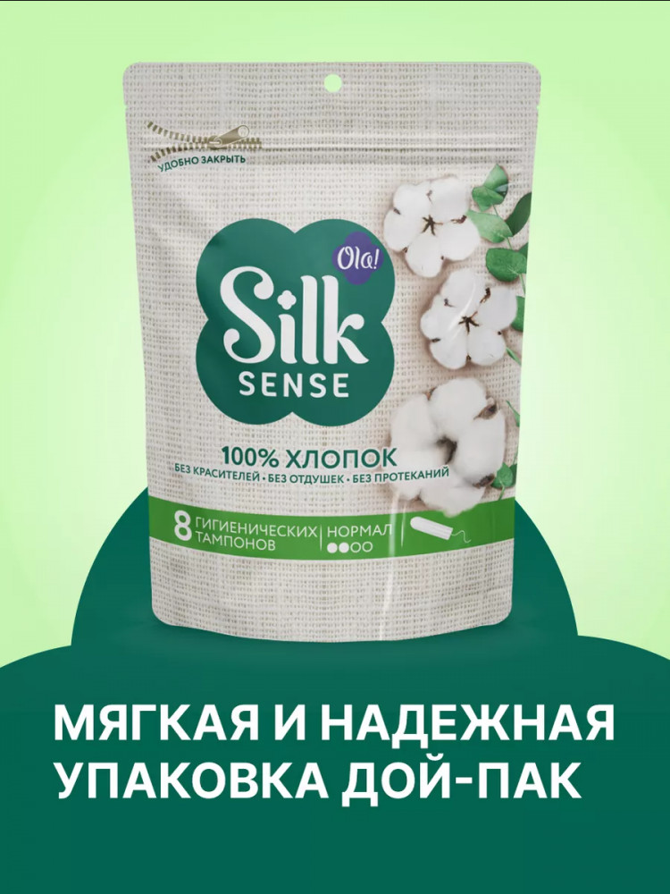 OLA! Silk Sense представляет новую линейку гигиенических тампонов. Они выполнены из 100% органического хлопка без добавления ароматизаторов, красителей и других химических веществ. Шелковистое покрытие и тонкий кончик обеспечивают комфортное введение. Во время использования тампон принимает форму тела, равномерно раскрываясь благодаря желобкам, расположенным по кругу. Мягкая и надежная упаковка дой-пак позволяет открывать и закрывать пачку много раз, удобна в использовании и хранении. Каждый тампон в индивидуальной упаковке. Размер Normal подойдет для нормальных выделений.