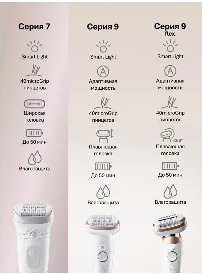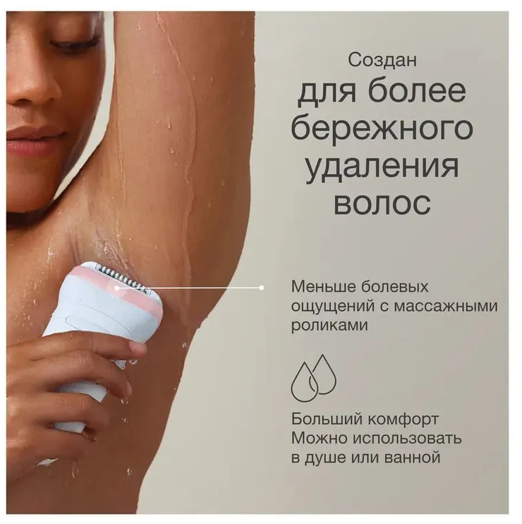 Аккумуляторный эпилятор с невероятной точностью удаляет даже самые короткие волоски, которые не способен удалить воск (до 0.5 мм), с помощью 40 пинцетов. Подсветкой Smartlight помогает не пропустить даже самые тонкие волоски. Эпилятор можно использовать в душе и промывать под водой, он 100% водонепроницаемый благодаря технологии Wet&Dry. Интеллектуальный датчик SensoSmart оповещает о давлении на кожу, предотвращая чрезмерный нажим. Работает от аккумулятора, 40 минут автономной работы после 1 часа зарядки.